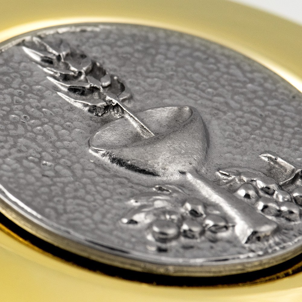 Teca Eucaristica in ottone dorato lucido con doratura 24 carati anche all'interno. La teca presenta sul coperchio una placca in rilievo color argento raffigurante il Calice. La teca è realizzata da un'azienda italiana, garantendo materiali di prima qualità.