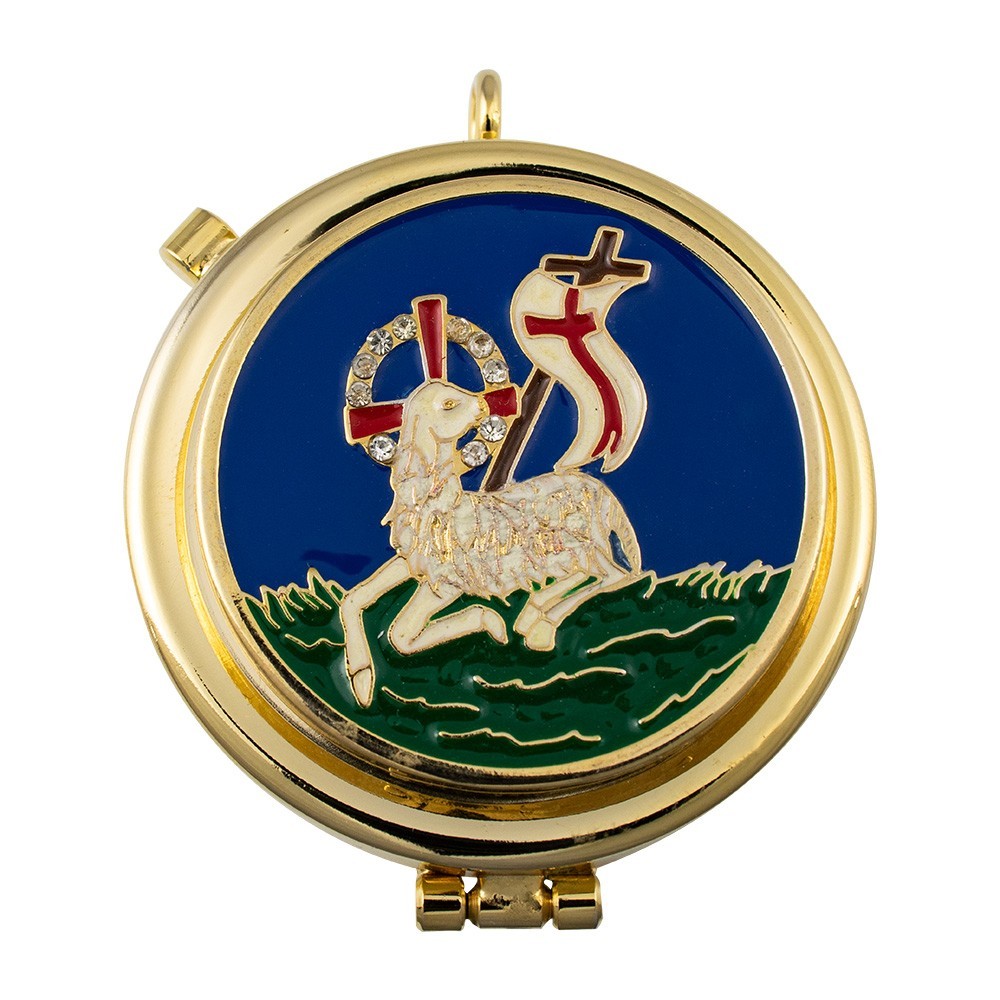 Teca per ostie in ottone con placca smaltata Agnello della Pace.