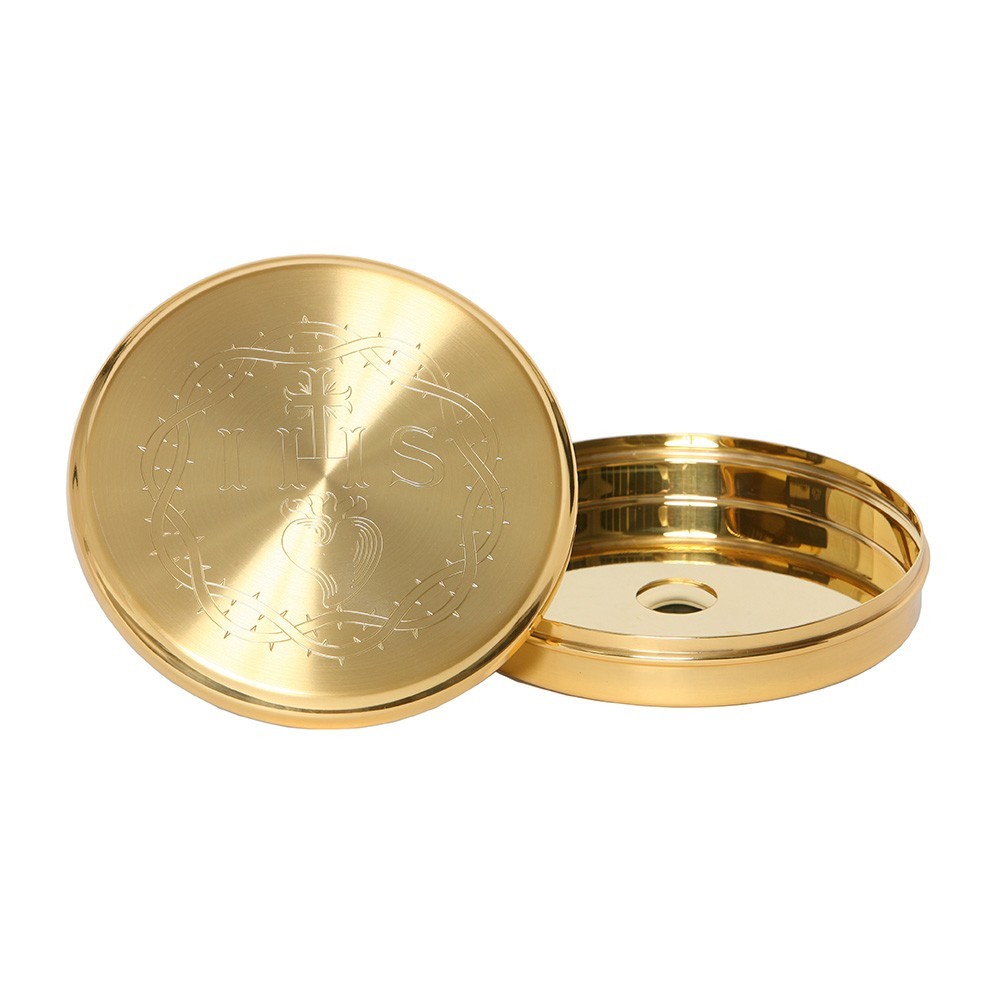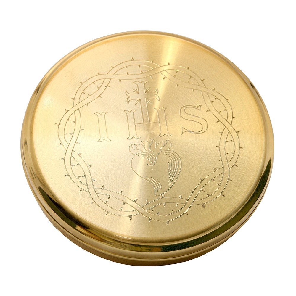 Teca eucaristica portaostie in ottone dorato. La teca è incisa con il simbolo JHS, Sacro cuore di Gesù e corona di spine. La teca è alta 3 cm ca e il suo diametro misura 15 cm ca. Articolo realizzato interamente in Italia, garantendo materiali e lavorazione di prima qualità.