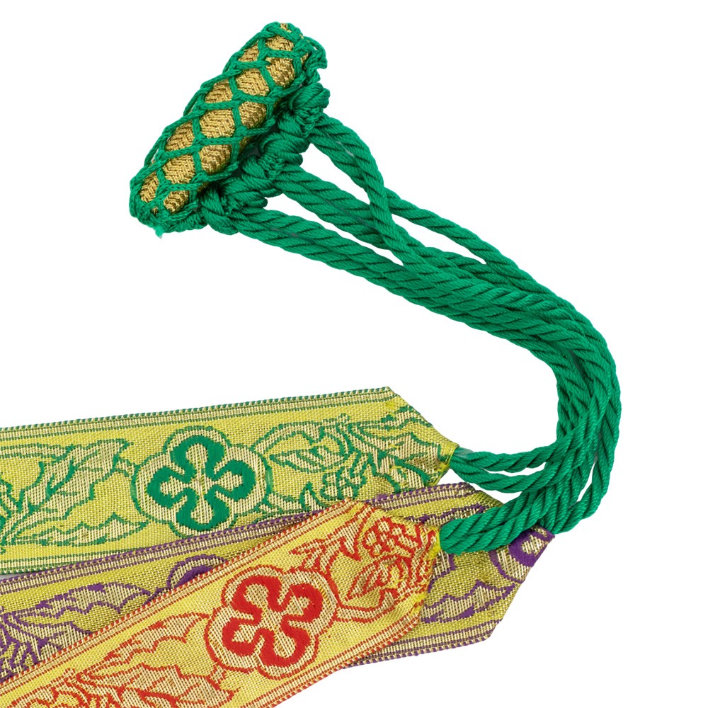 I nastri sono ricamati finemente a macchina con bordi rifiniti e sono alti circa 45 cm. Il cordoncino è in nylon di colore verde.