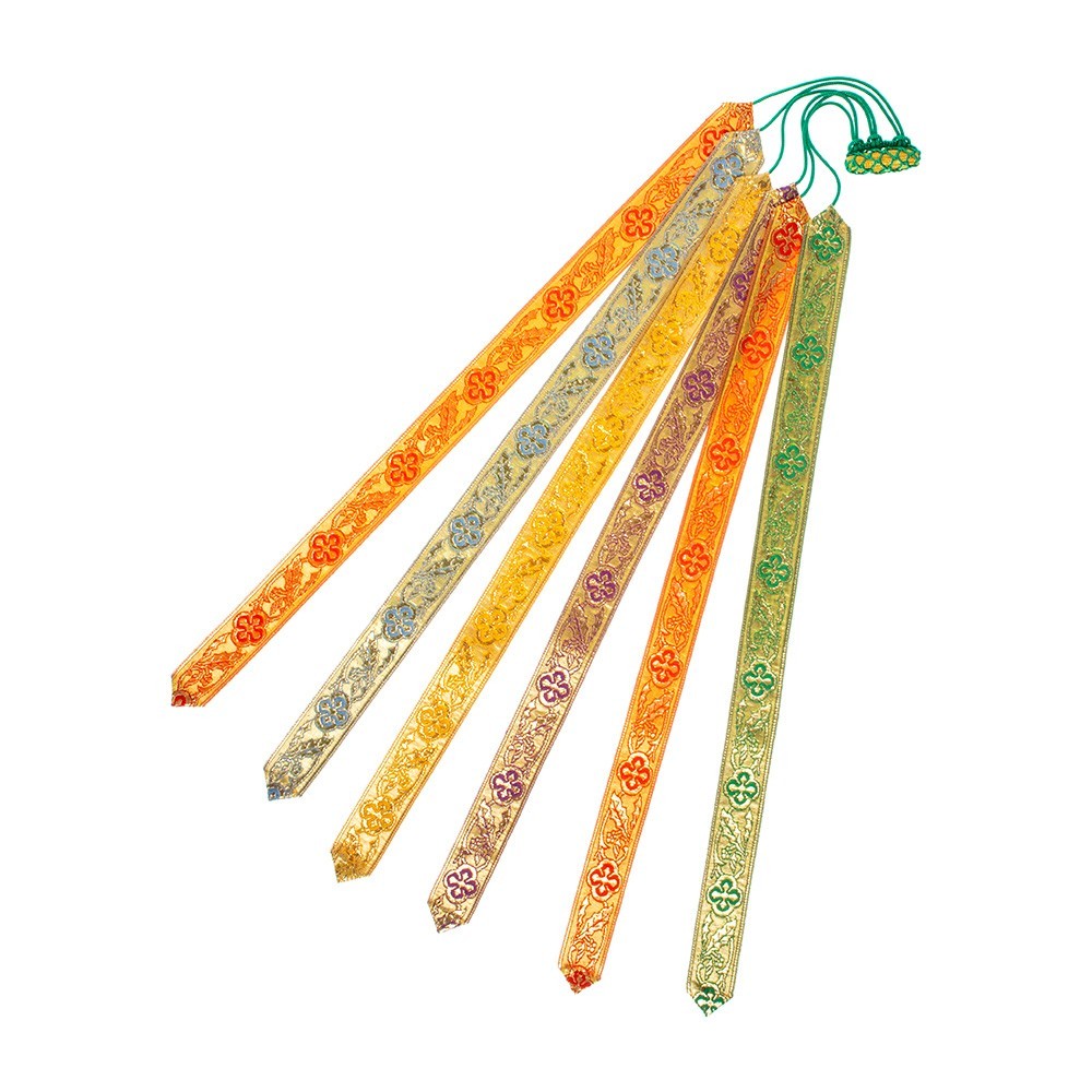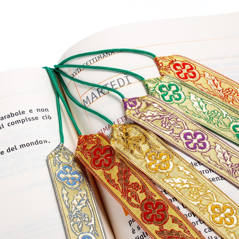 Segnacolo segnalibro Lusso a 6 nastri colorati in tessuto poliestere. Le decorazioni dei nastri sono realizzate con ricamo a macchina. Il cordoncino è in nylon verde. Questo accessorio liturgico è adatto per il messale, il lezionario e i testi liturgici.