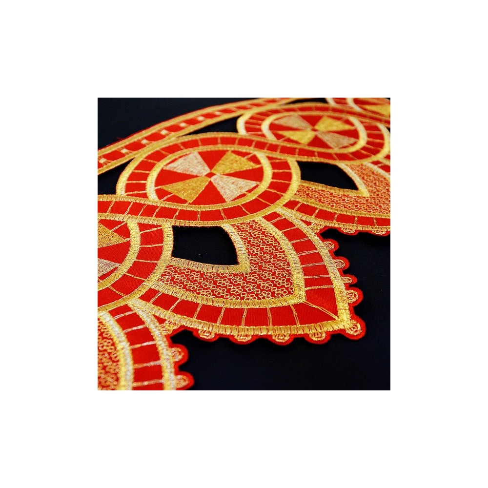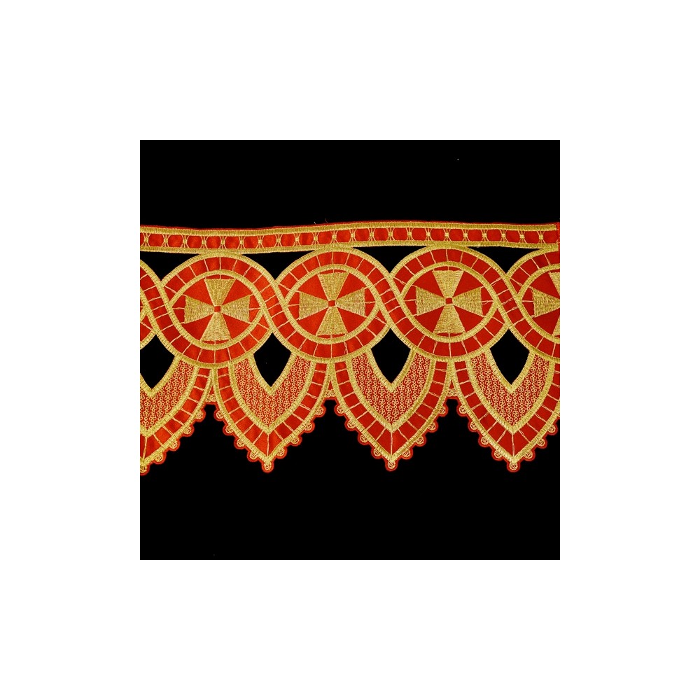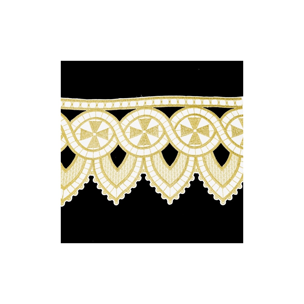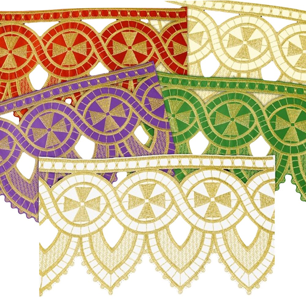 Bordo per altare in misto cotone con ricami dorati. Questa balza è ideale per chiese e cappelle, anche da cimitero, è disponibile nei colori liturgici: avorio, bianco, rosso, verde, viola.