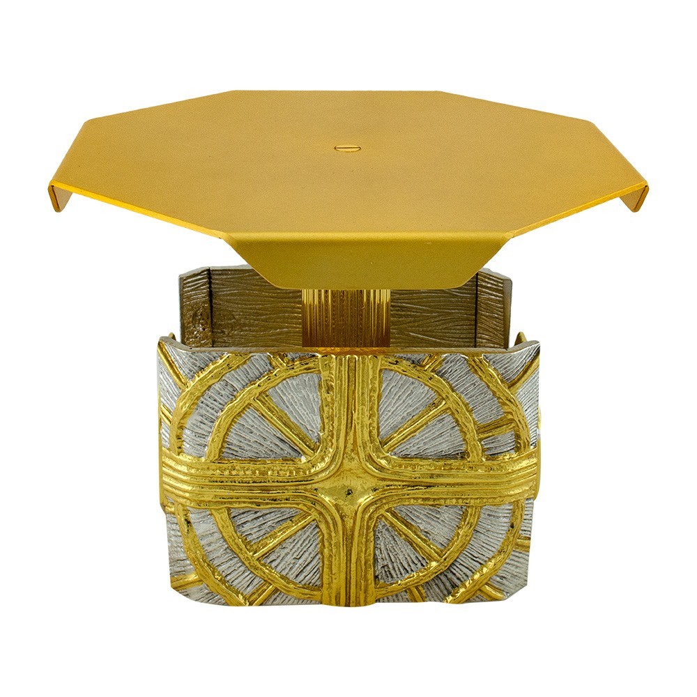 Tronetto per ostensorio realizzato in ottone bicolore, impreziosito da una croce decorata dorata e raggiata su uno sfondo argentato.