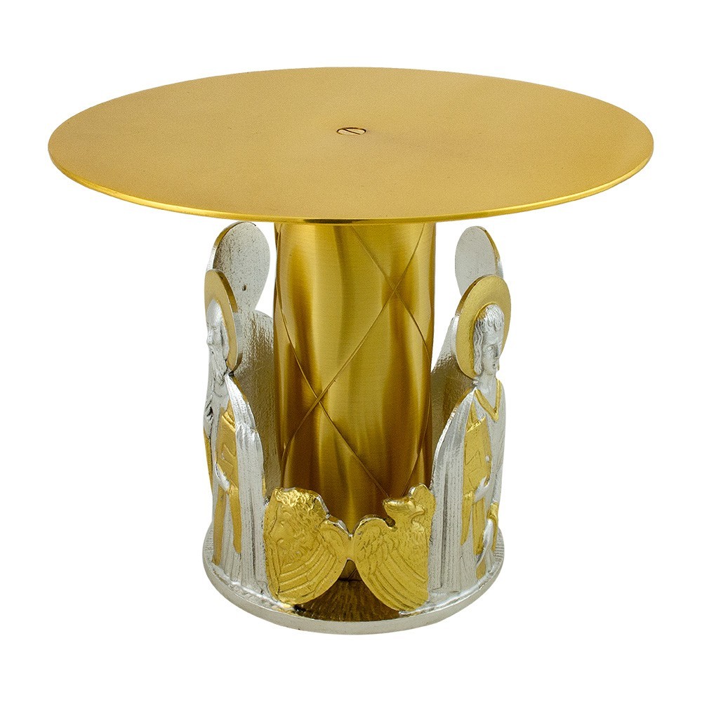 Questa base per ostensorio è prodotta interamente in ottone bicolore, decorata con le raffigurazioni dei quattro Evangelisti.