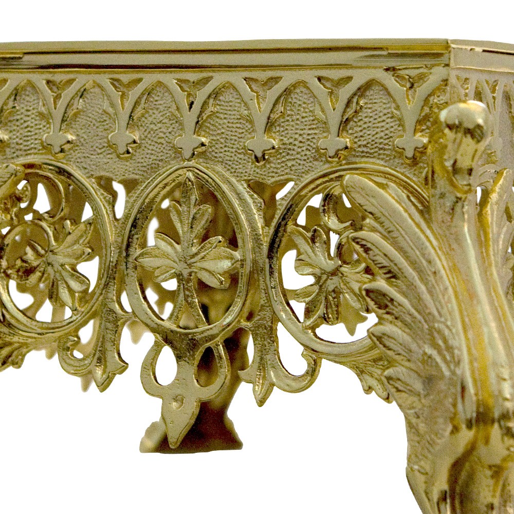 Questa base per ostensorio è decorata in stile barocco interamente in ottone dorato.