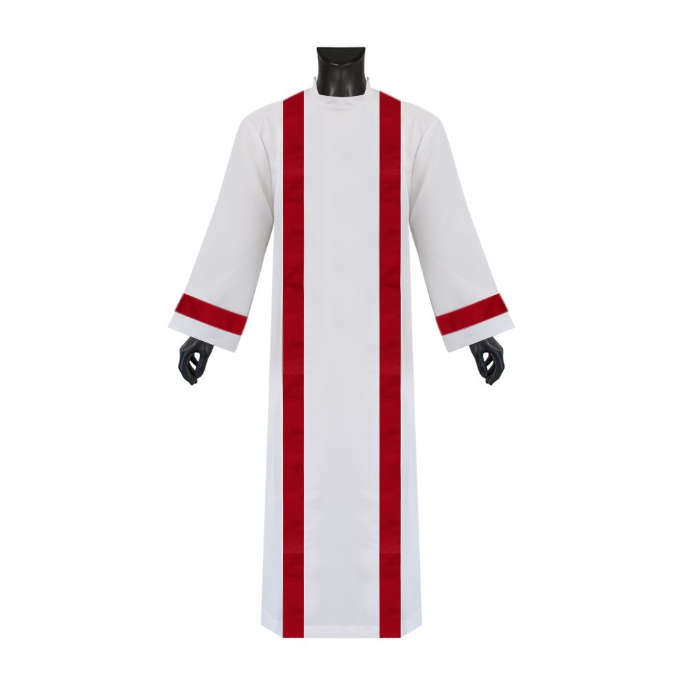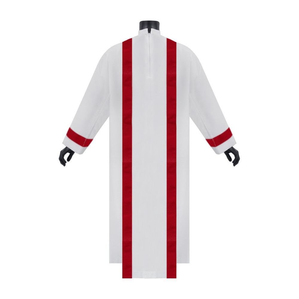 Tarcisiana per ministranti e chierichetti, modello con cerniera posteriore. La tunica è confezionata in tessuto di poliestere leggero nella colorazione bianca con galloni rossi, garantendo comfort e durata nel tempo. Perfetta per ministranti, chierichetti e celebrazioni liturgiche solenni, specialmente quando partecipano numerosi ragazzi.