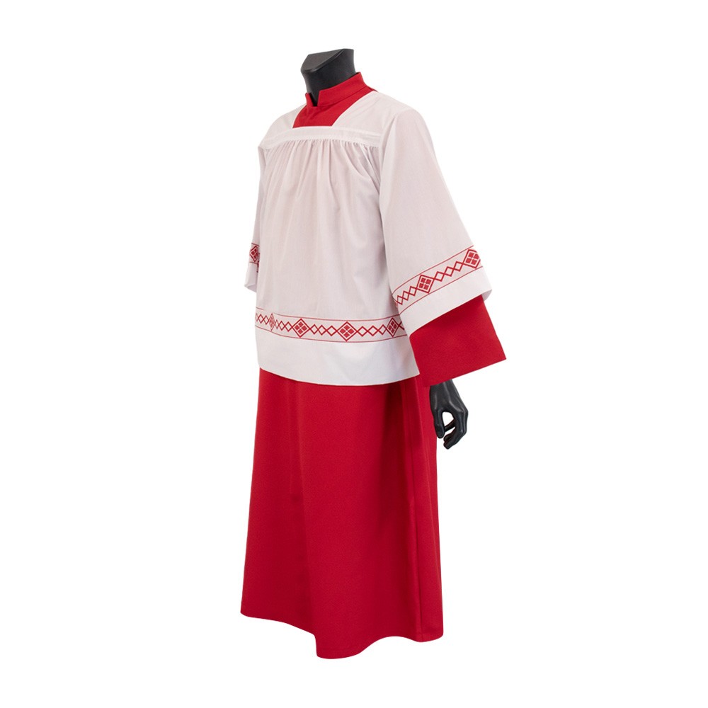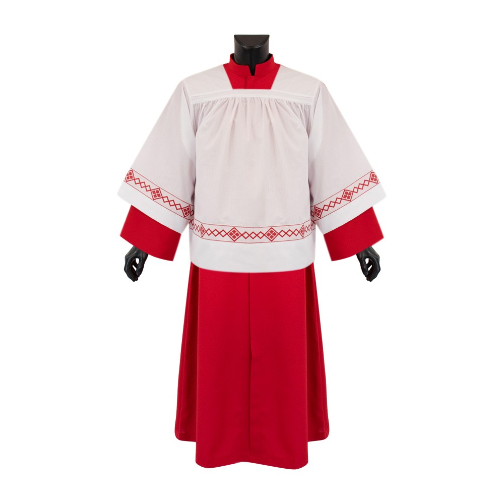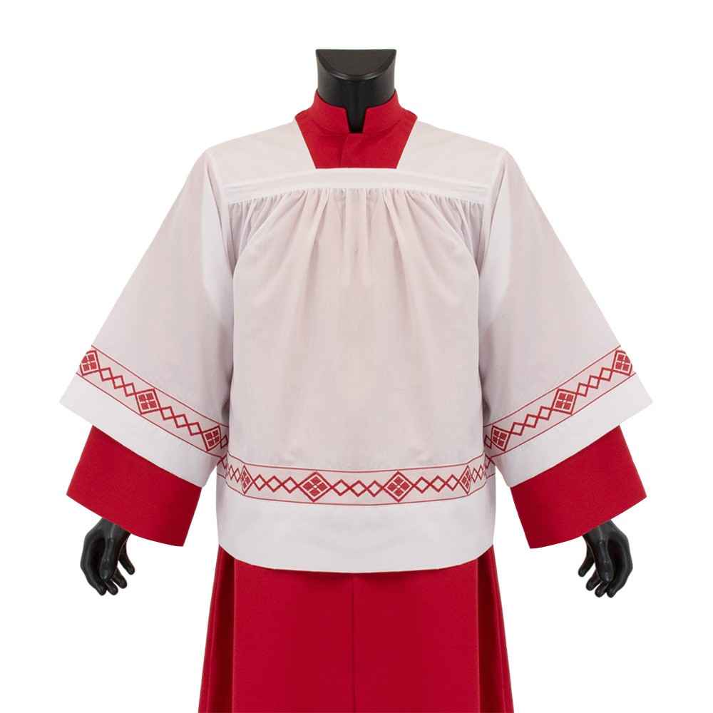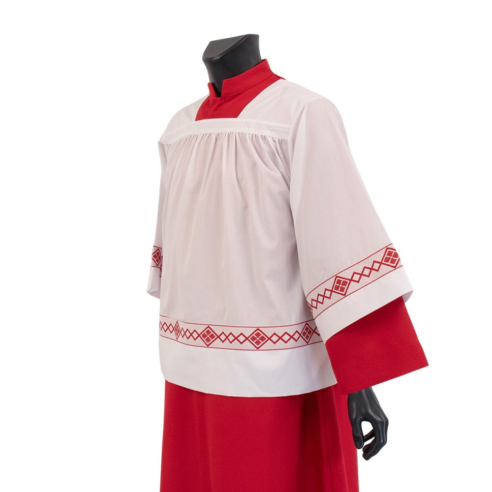 Questa cottina in cotone bianco e poliestere con bordino a ricami geometrici è pensata per i chierichetti, perfetta per essere abbinata a una tunica rossa (la tunica non è compresa).