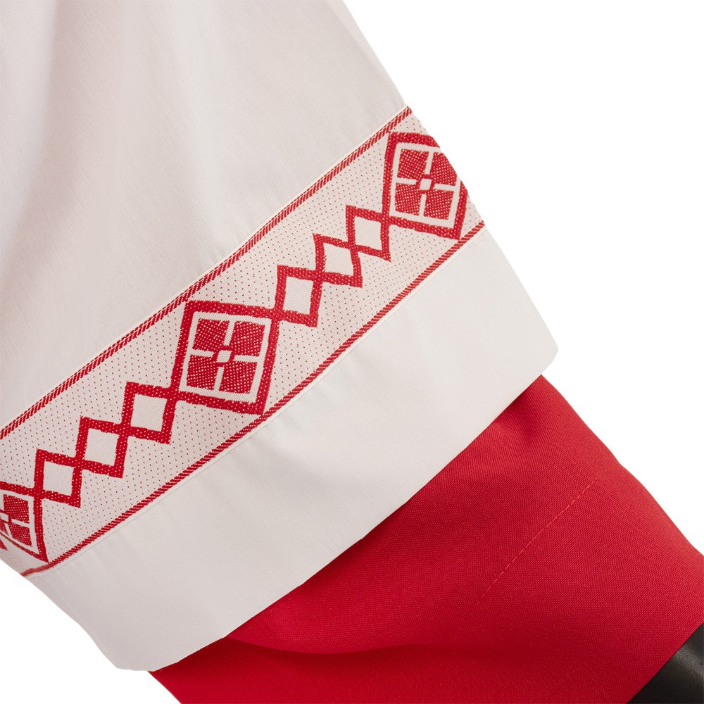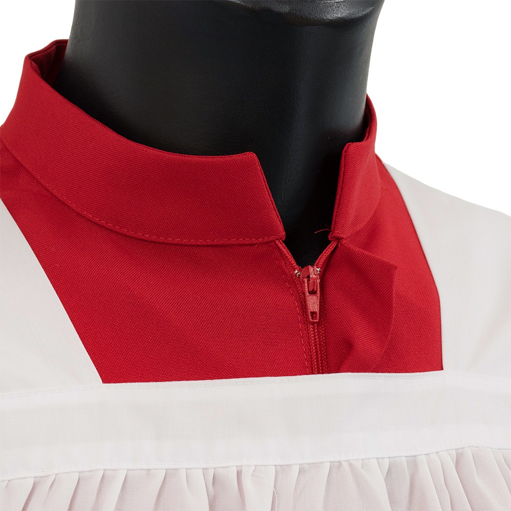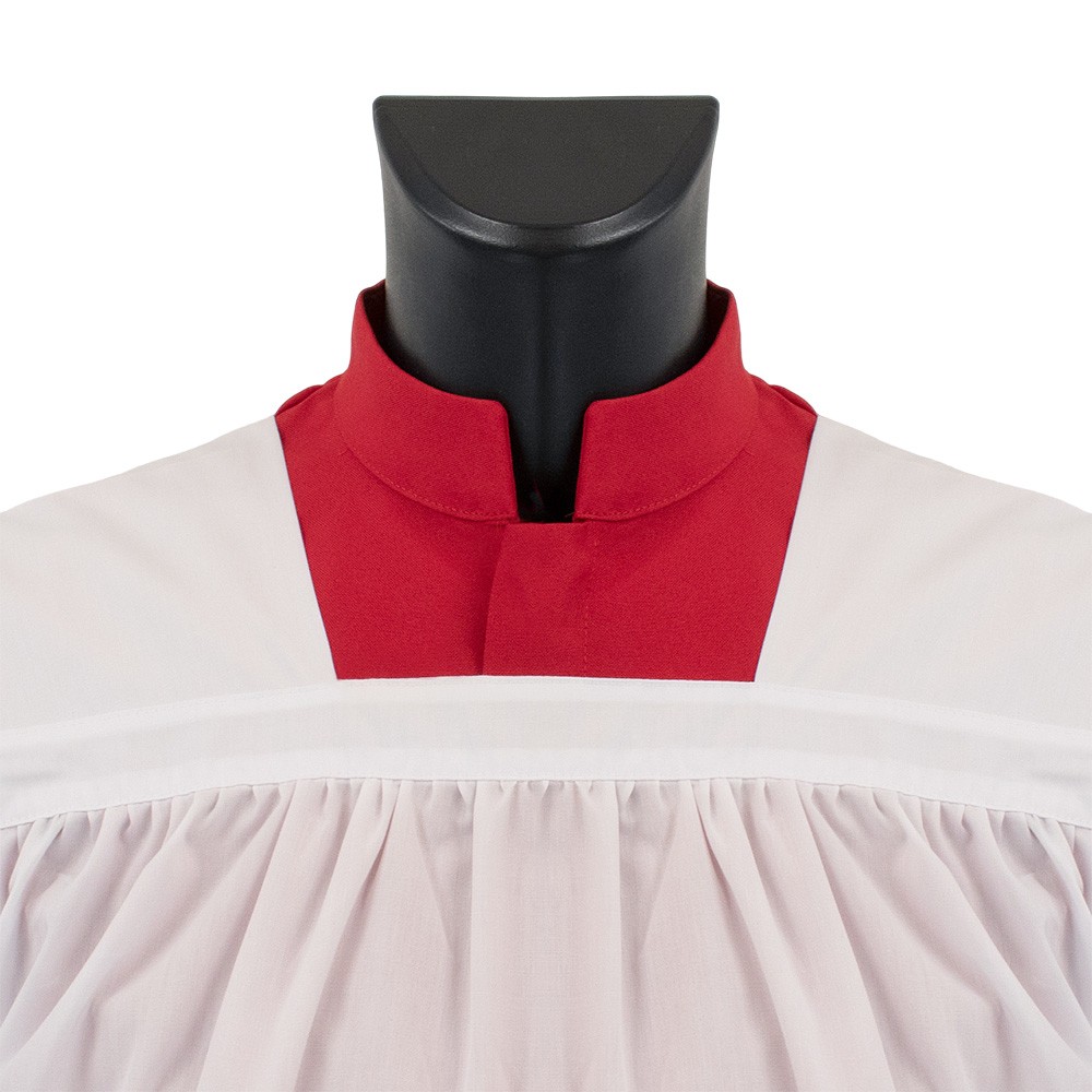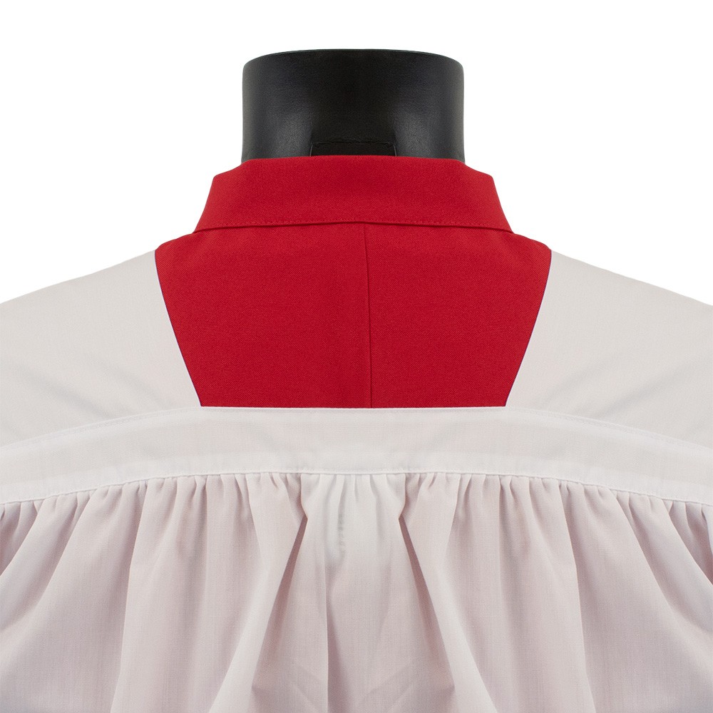 Questa cottina in cotone bianco e poliestere con bordino a ricami geometrici è pensata per i chierichetti, perfetta per essere abbinata a una tunica rossa (la tunica non è compresa).
