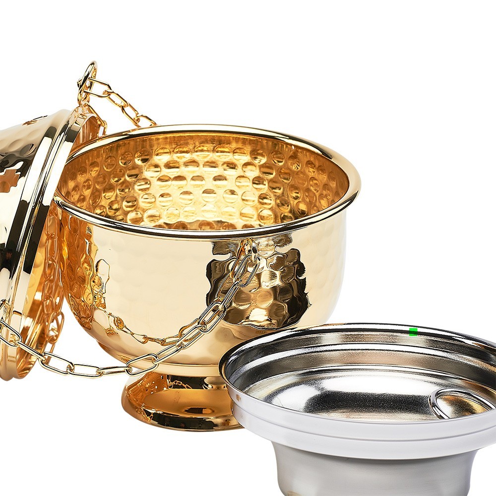 Turibolo in ottone con finitira dorata. Fornito completo di catene e cestello estraibile per un lavaggio più comodo. Sul coperchio sono presenti dei fori che permettono la fuoriuscita del profumo.