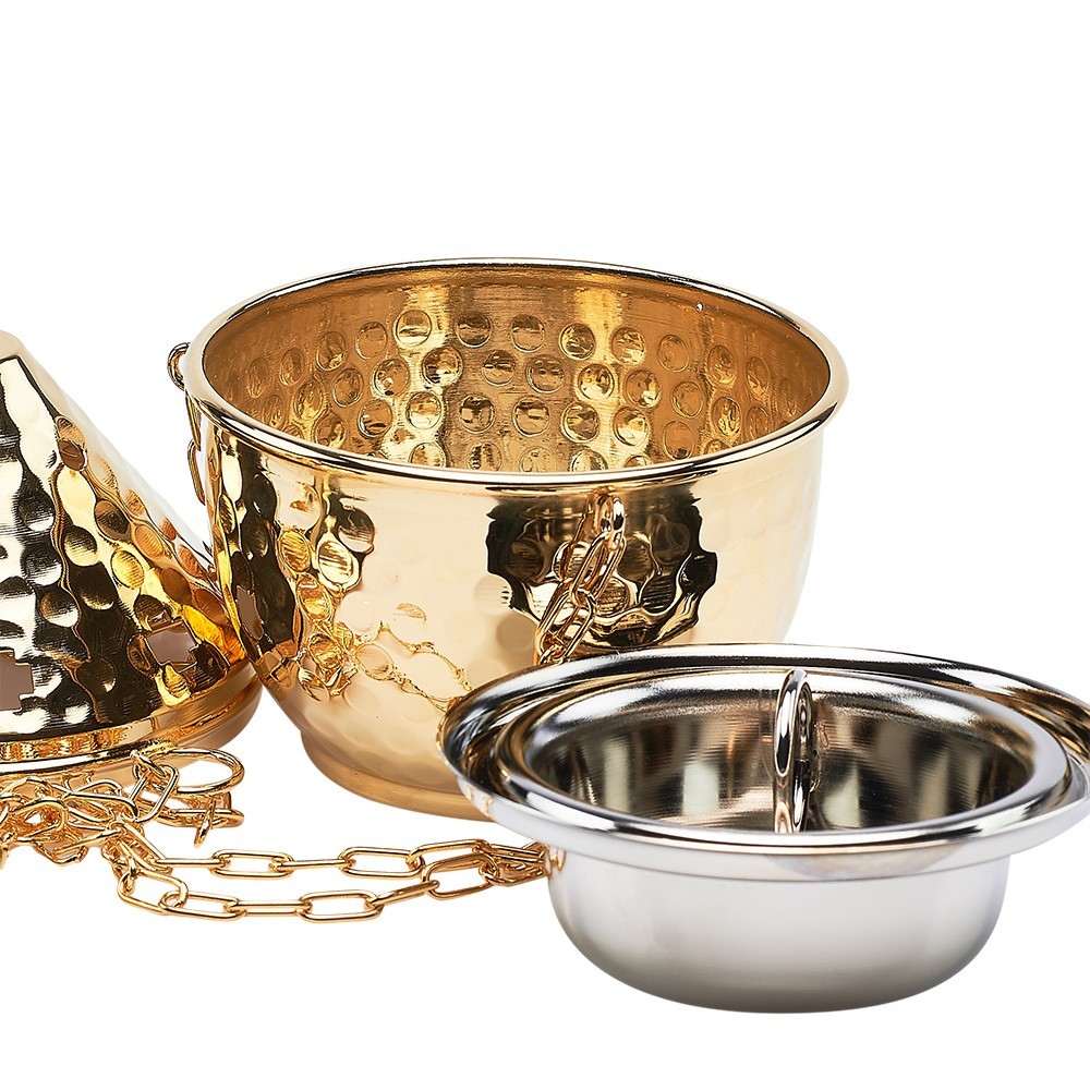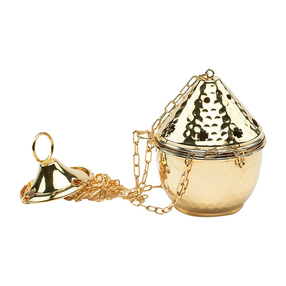 Turibolo in ottone dorato con coperchio martellato. Sul coperchio vi sono dei piccoli fori per permettere la fuoriuscita del profumo.