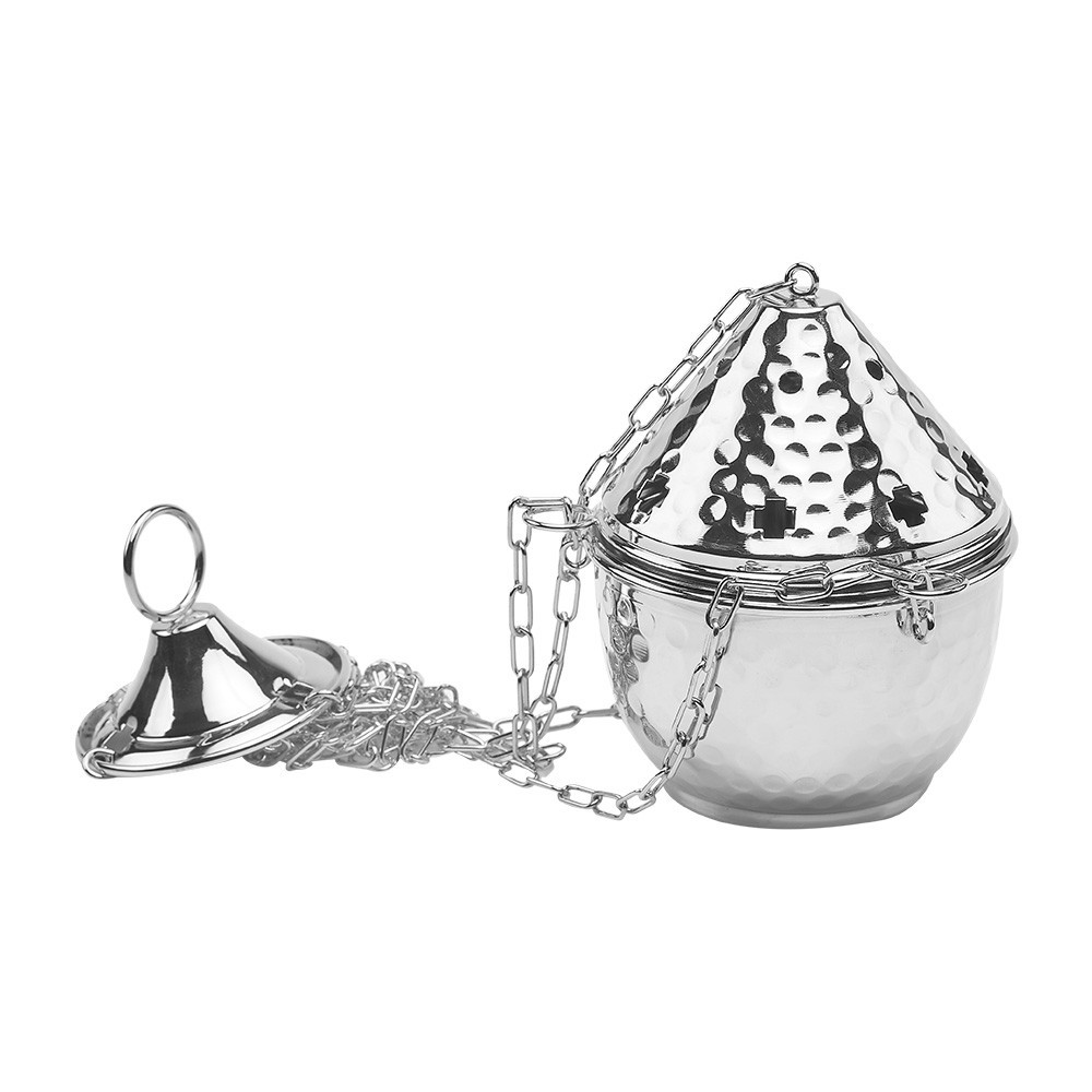 Turibolo con coperchio martellato realizzato completamente in ottone nichelato. Sul coperchio sono presenti dei piccoli fori per permettere la fuoriuscita del profumo.