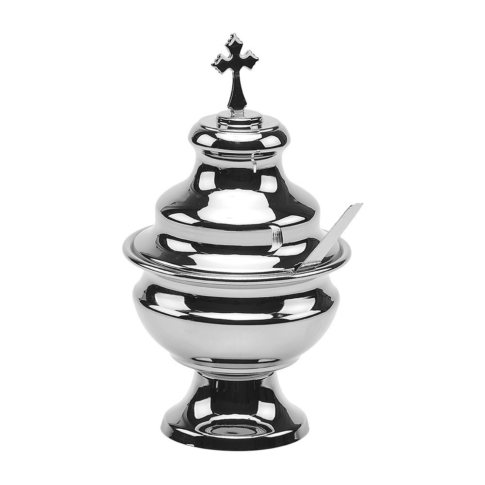 Navetta per turibolo classico. Realizzata in ottone con finitra nichelata e liscia. Produzione italiana.