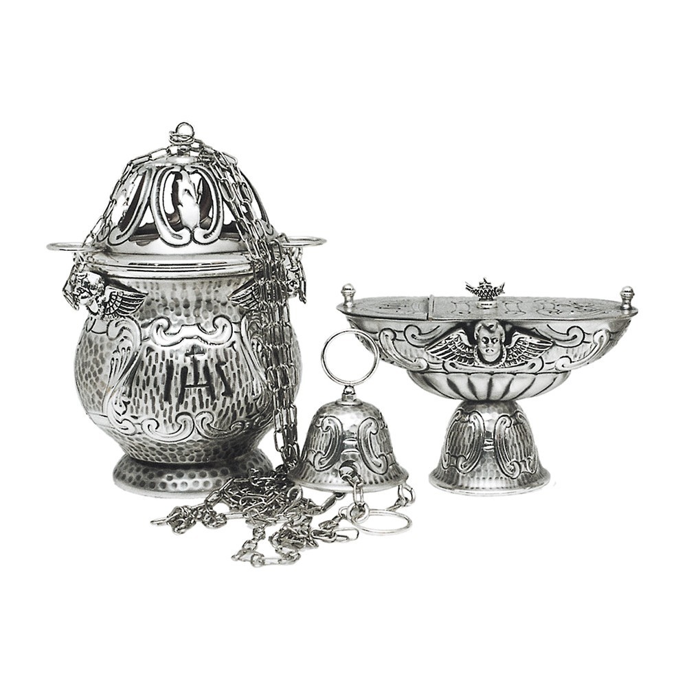 Questo coordinato turibolo con navicella è cesellato finemente a mano, decorato e martellato sul fondo. Arricchito con i simboli JHS, Pax e ornato da Angeli. La navicella è di forma allungata, completa di cucchiaino e interno estraibile.