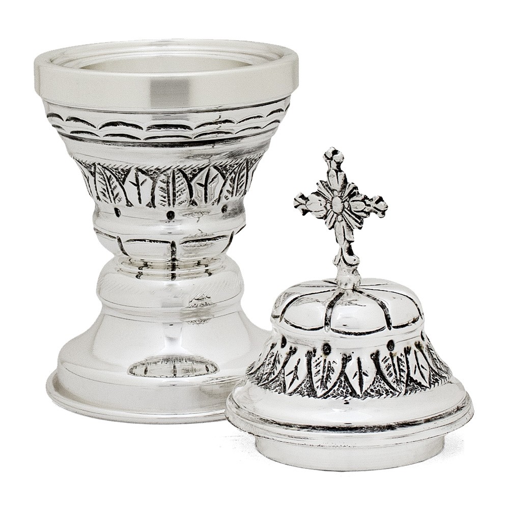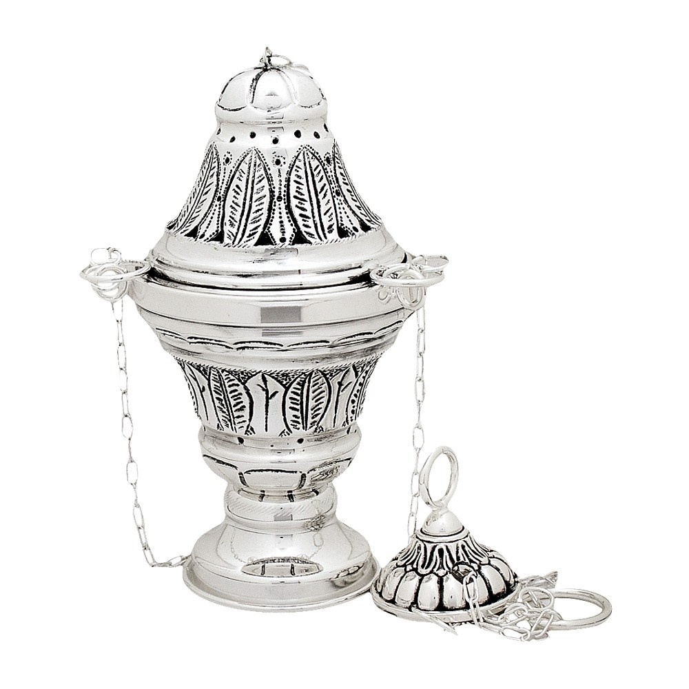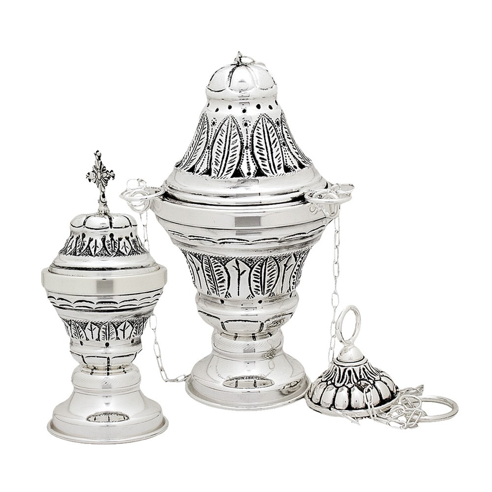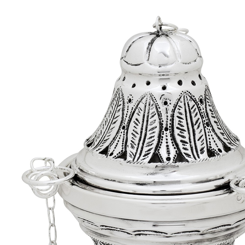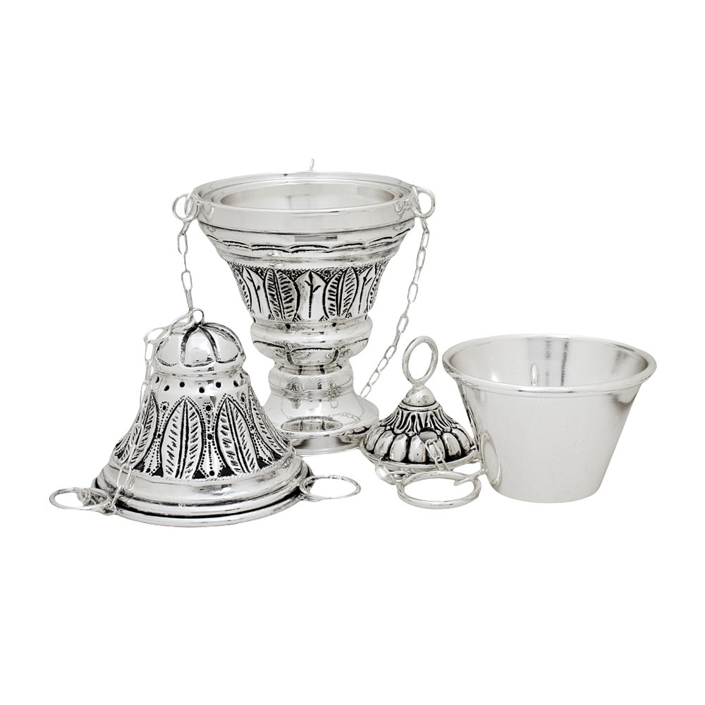 Questo set turibolo e navicella è in ottone argentato cesellato interamente a mano da mastri cesellatori.
