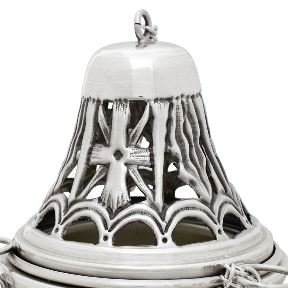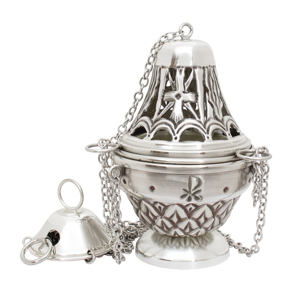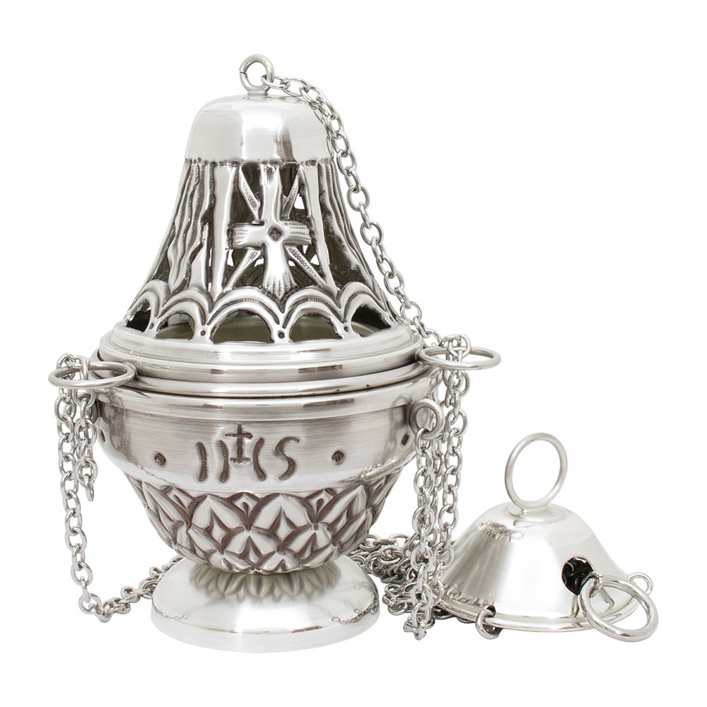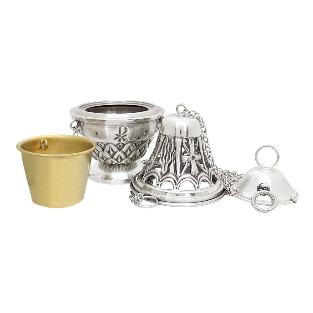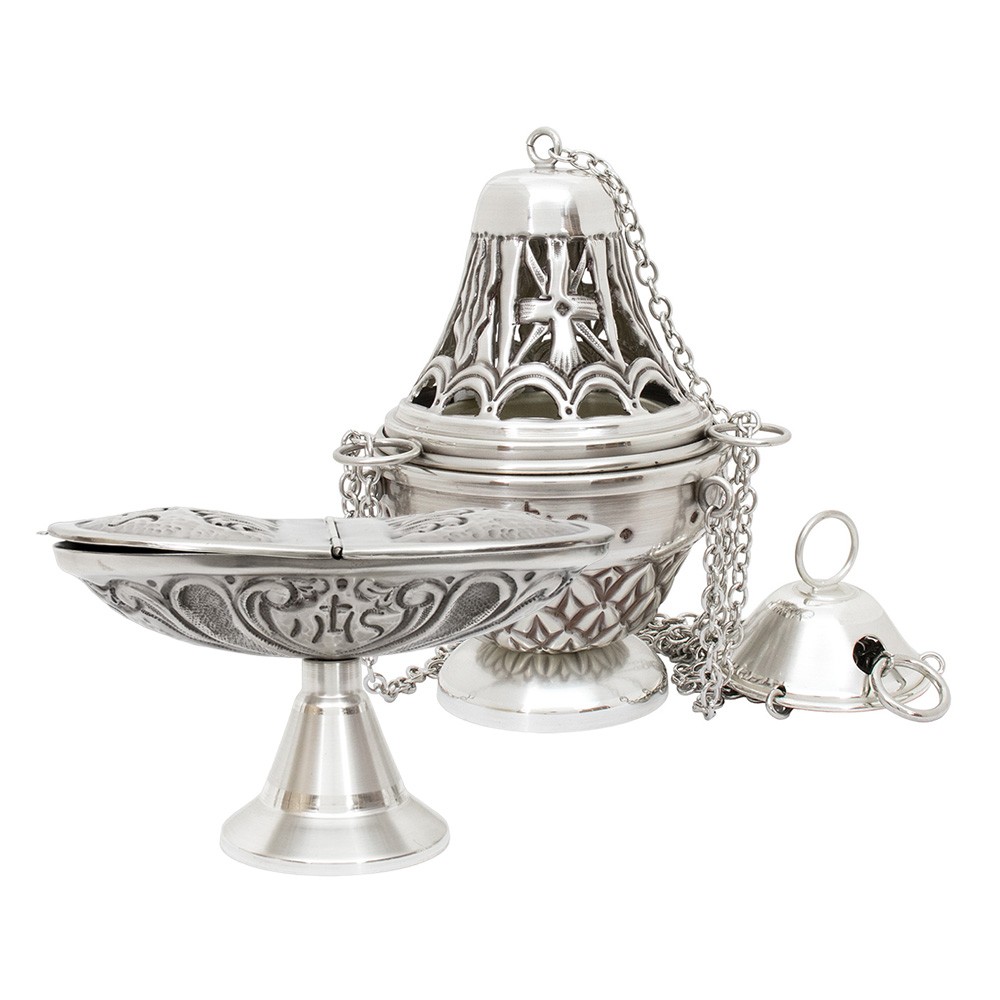 Il set liturgico comprende turibolo con cestello estraibile e navetta, realizzati in ottone con finitura argentata.