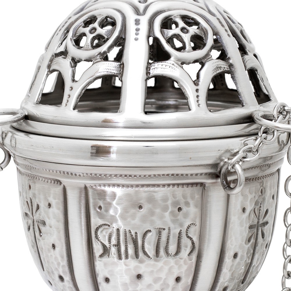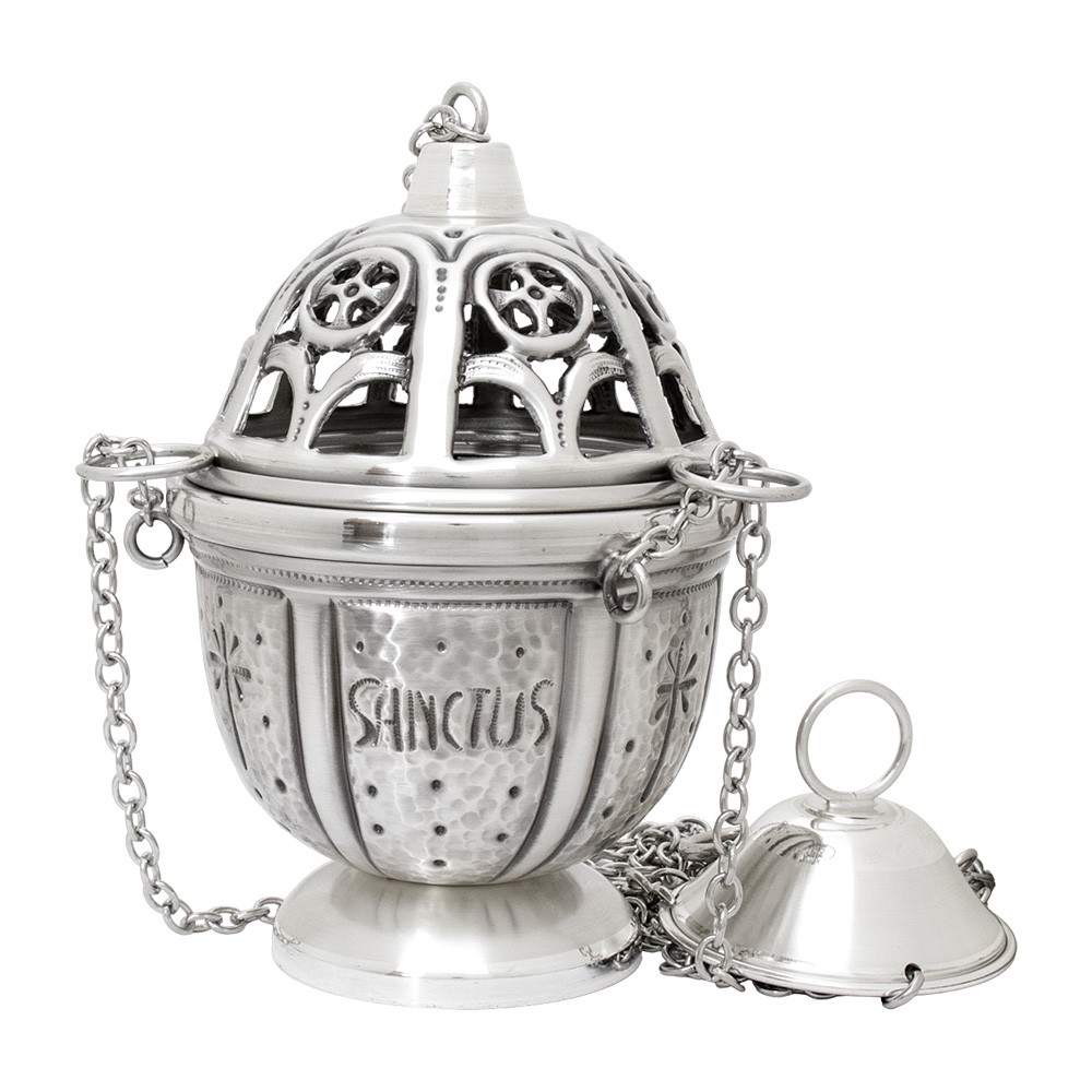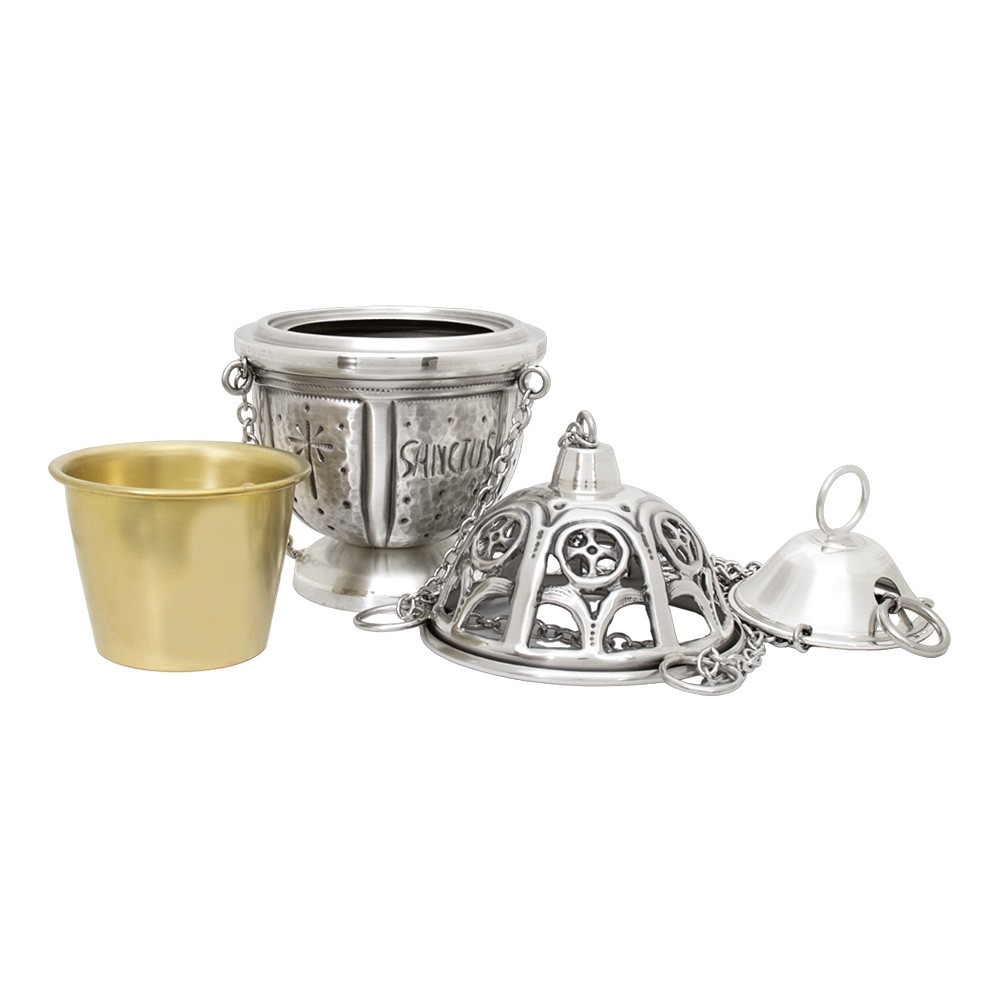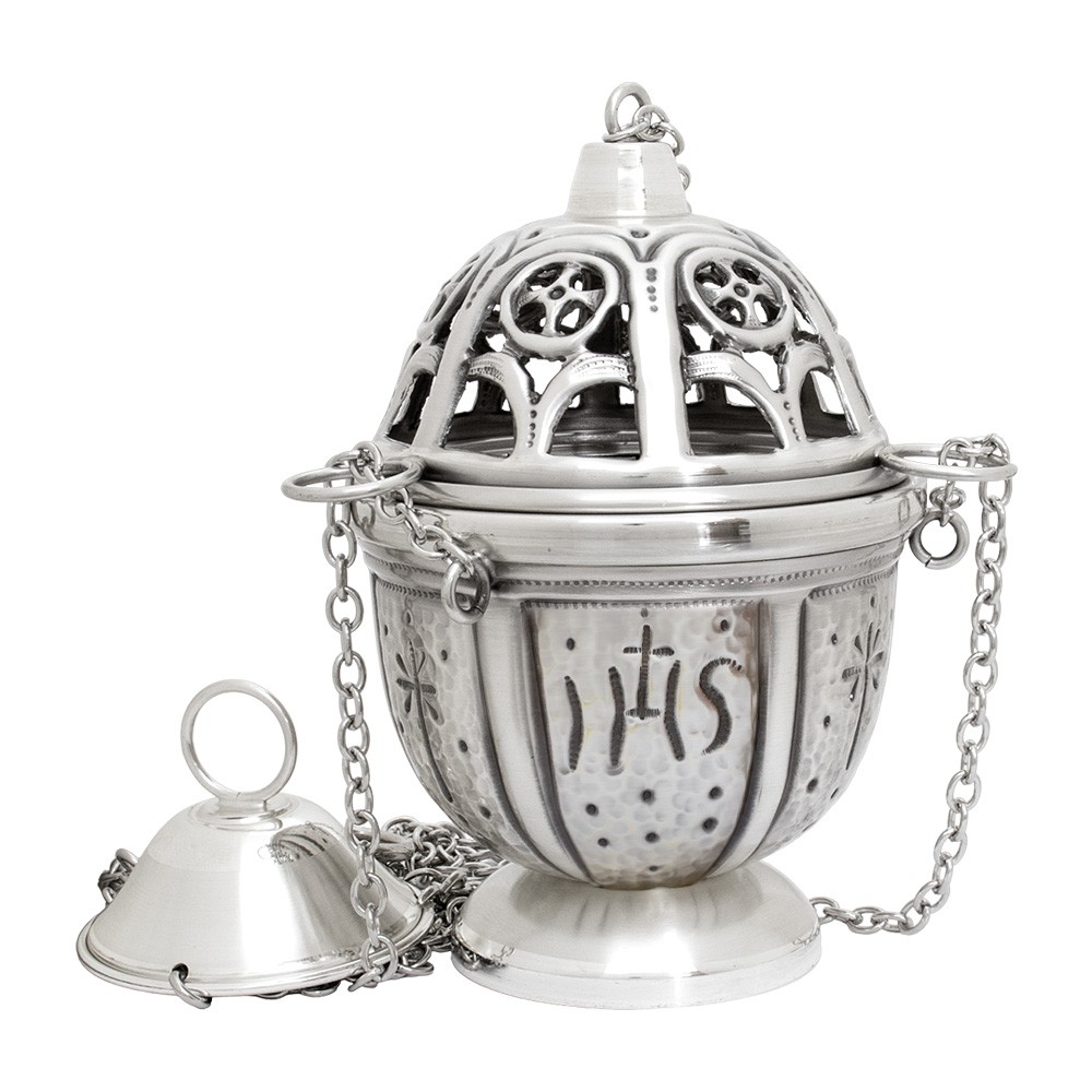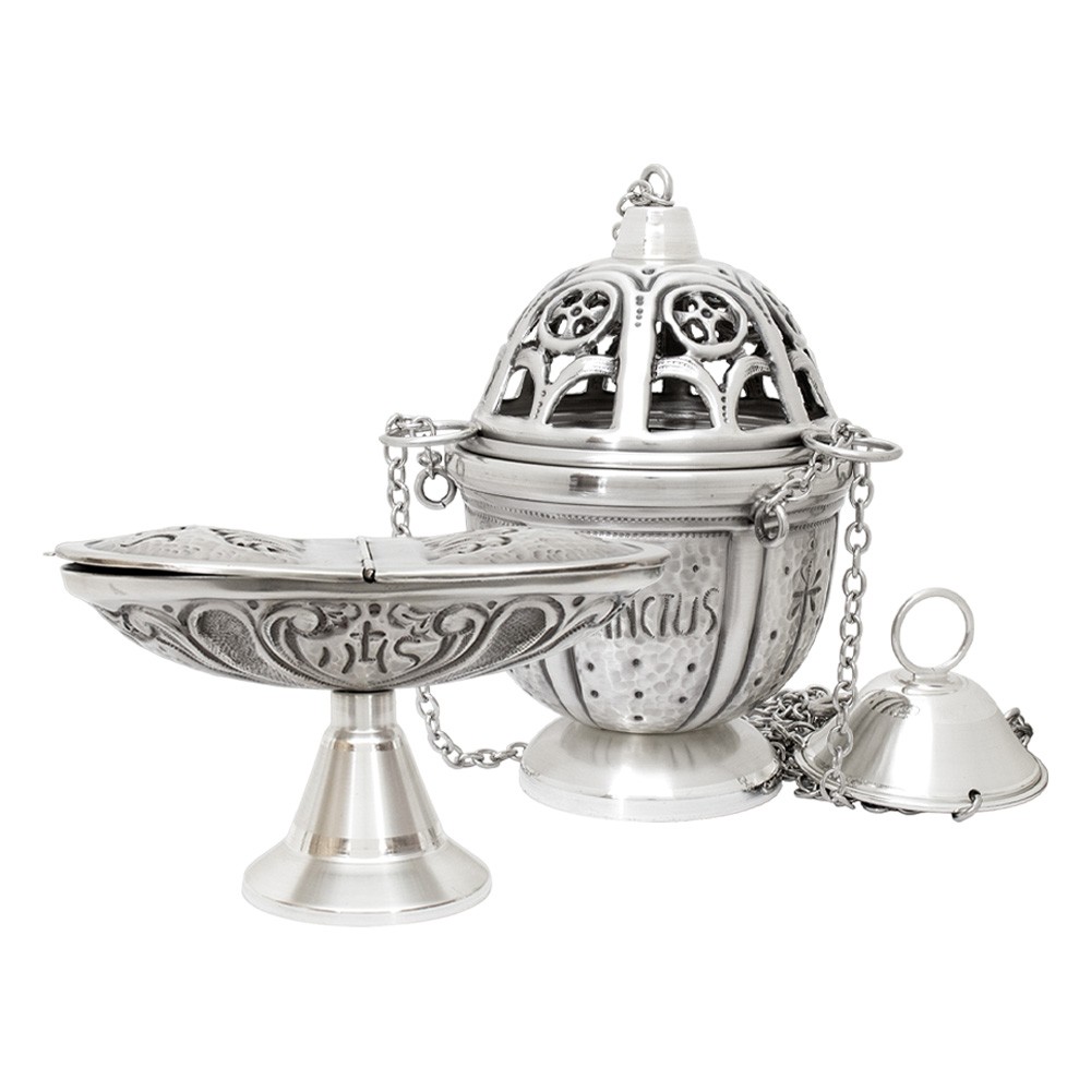 Il set comprende il turibolo con cestello estraibile e navetta, realizzati in ottone con finitura argentata.