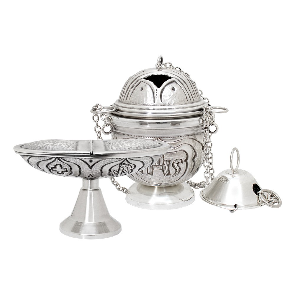 Questo pregiato set liturgico comprende turibolo con cestello estraibile e navetta, realizzati in ottone con finitura argentata.
