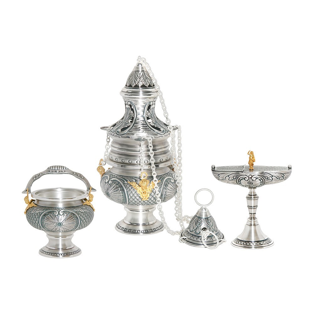 Set composto da turibolo, navicella e secchiello. Realizzati in ottone argentato, cesellato finemente a mano con decori a conchiglia e arricchito con angeli dorati. Articolo di ottima qualità e di particolare bellezza, produzione 100% italiano.