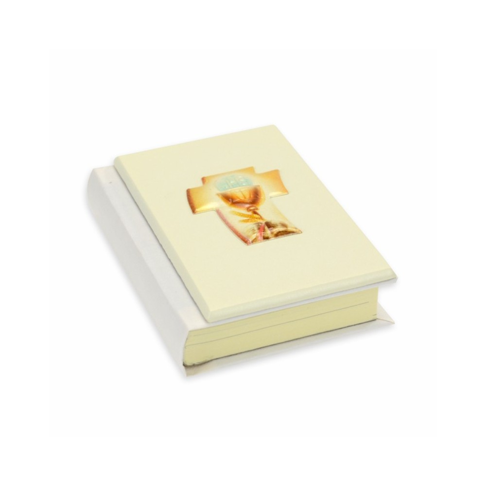 Vangelo Prima Comunione con placchetta Croce applicata in finitura madreperla color avorio. Il vangelo è alto 11 cm ed è largo 7 cm. Realizzato e prodotto da un'azienda italiana, garantendo l'unicità di ogni articolo e cura nei minimi dettagli.