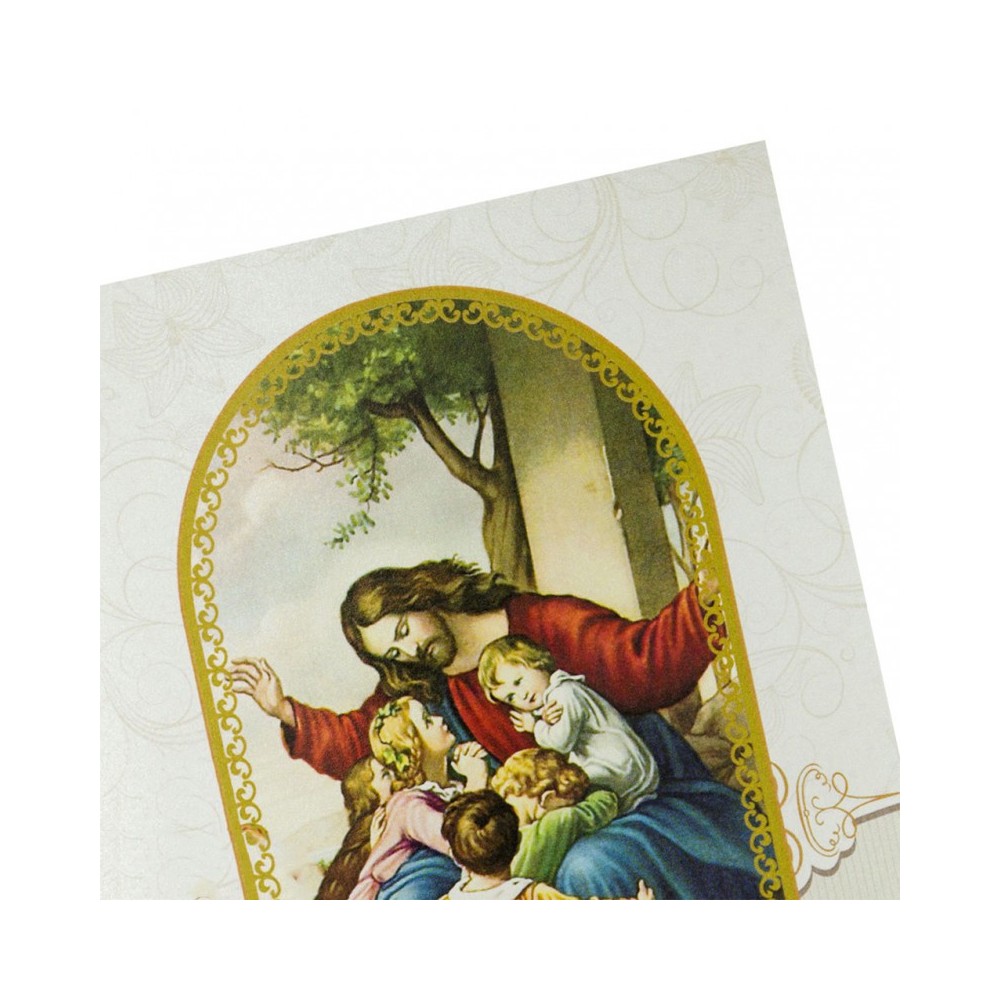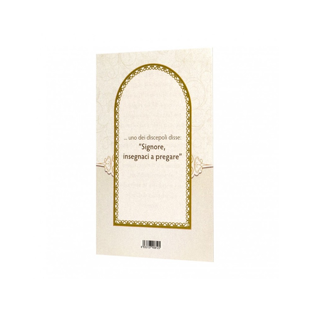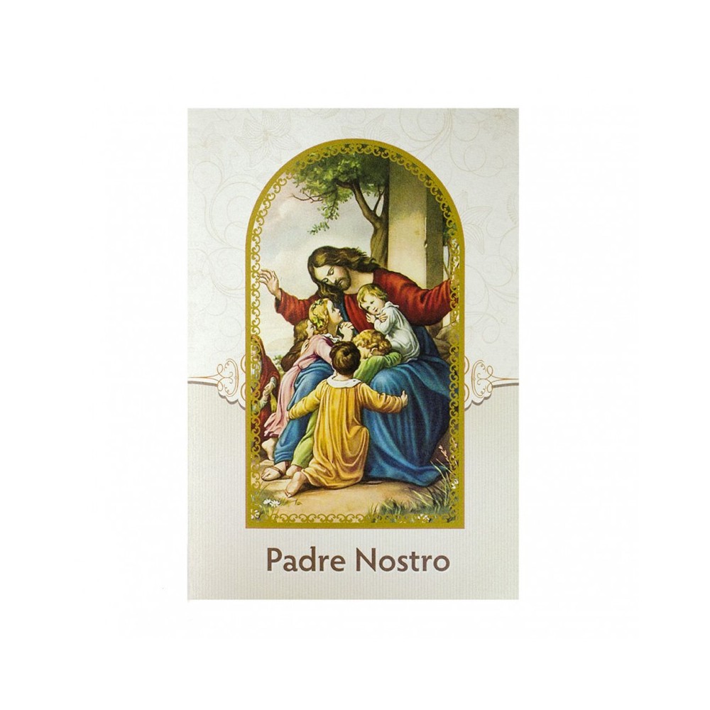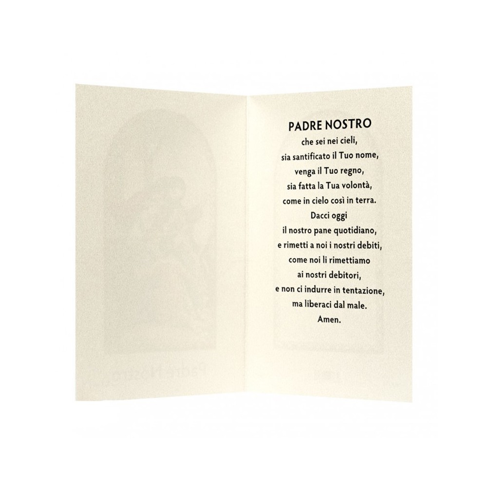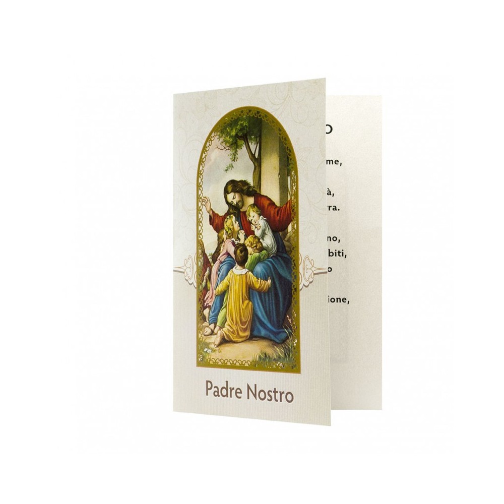 Cartoncino pieghevole con preghiera del Padre Nostro. Il pacchetto prevede 10 cartoncini pieghevoli. Ogni cartoncino è imbustato singolarmente. Il cartoncino chiuso misura 15x10 cm, aperto 20,5x10 cm.