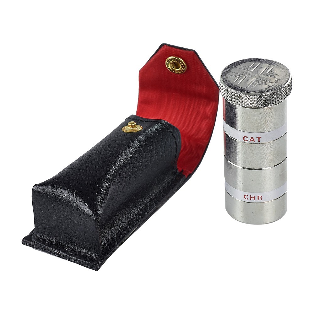 Questi vasetti sono completi di astuccio in semilpelle nero e l'interno è in tessuto rosso. I vasetti per oli sacri sono realizzati in metallo argentato con scritta in rosso CAT e CHR. Produzione italiana.