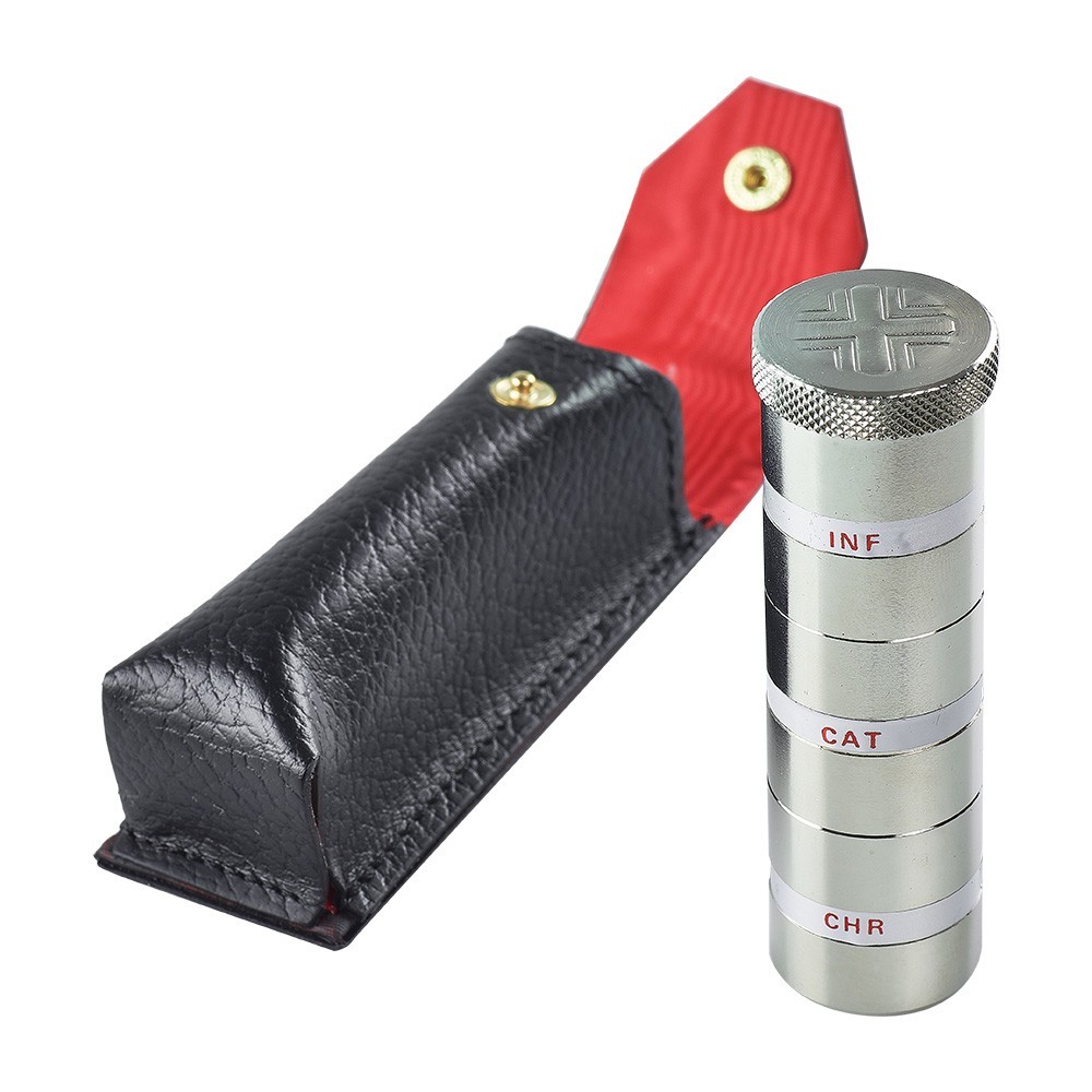 Vasetto triplo per oli santi completo di astuccio in semilpelle nero e interno in tessuto rosso.