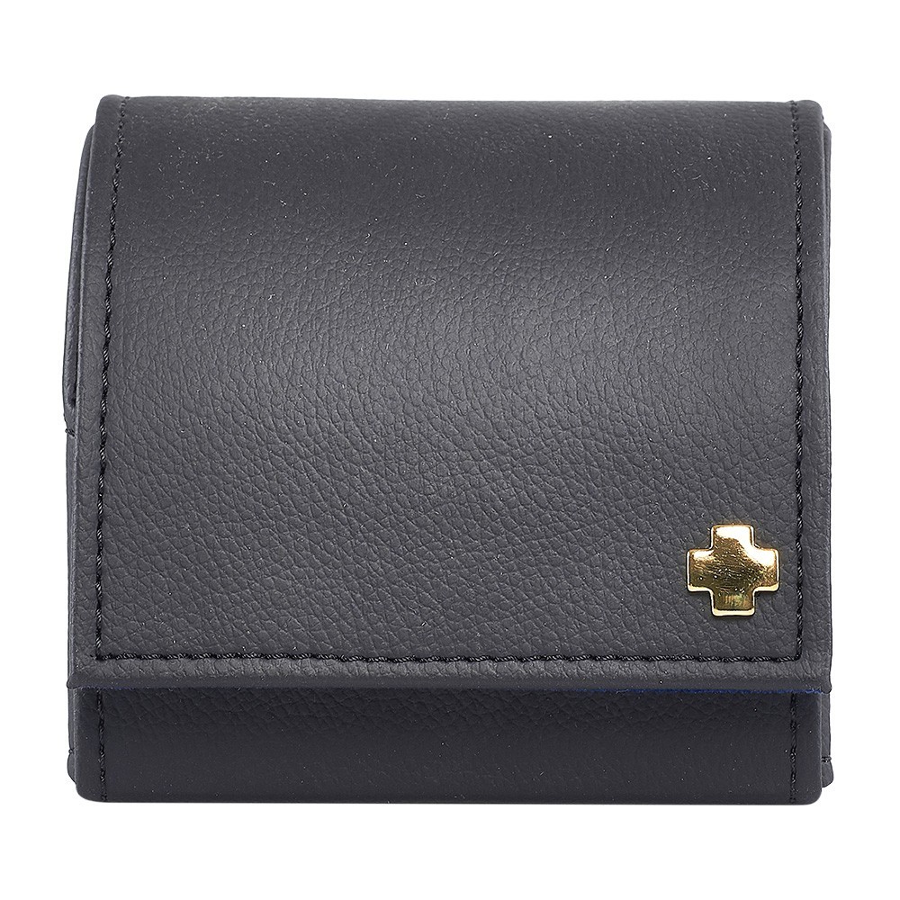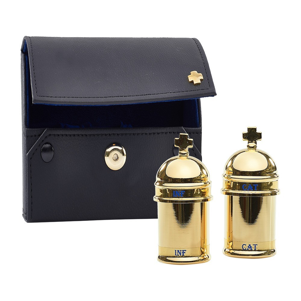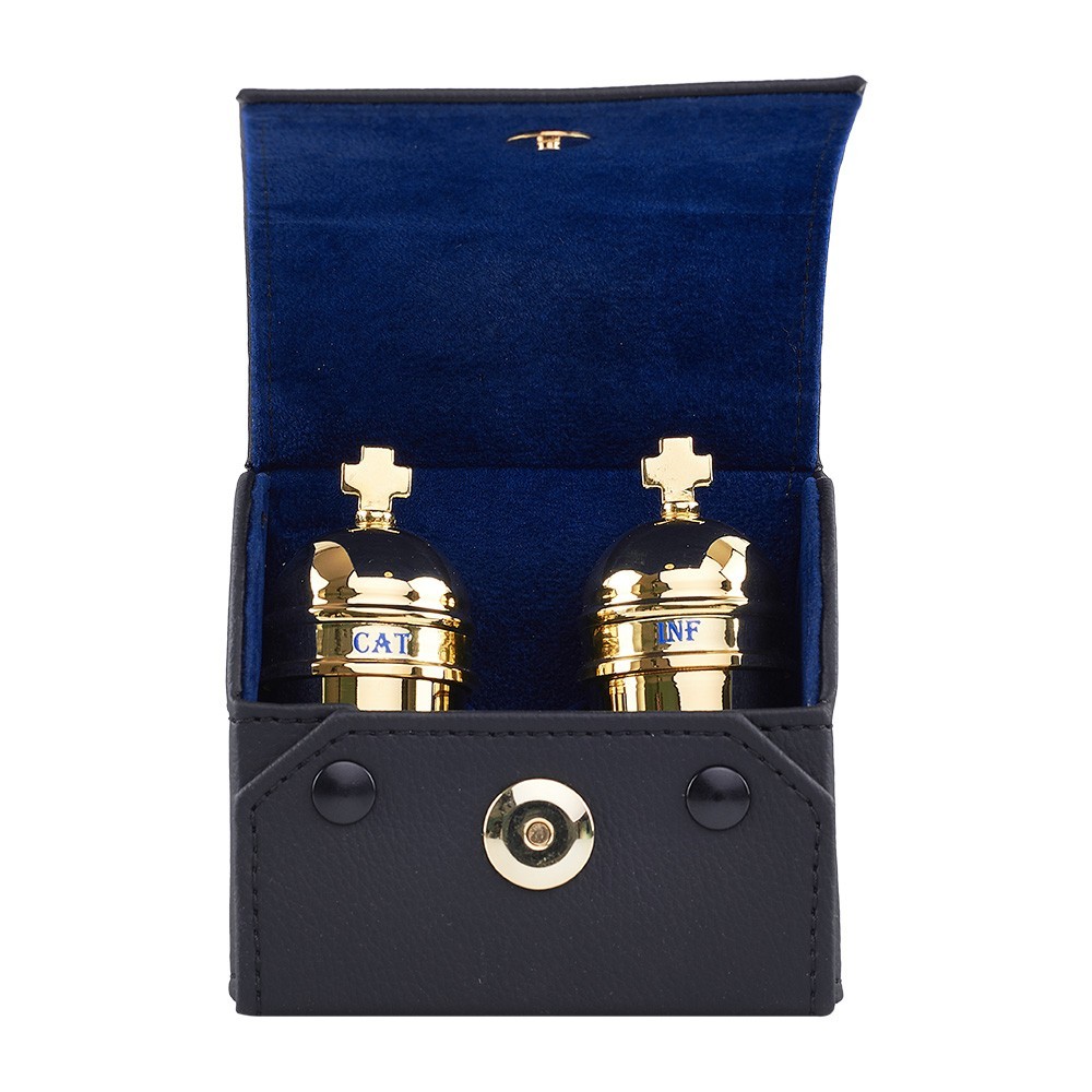 Custodia con due vasetti per oli sacri (Catecumeni e Infermi) in metallo dorato. L'interno dei vasetti è in vetro estraibile, completi di tappi con croce. L'astuccio è di colore nero con chiusura a clips.