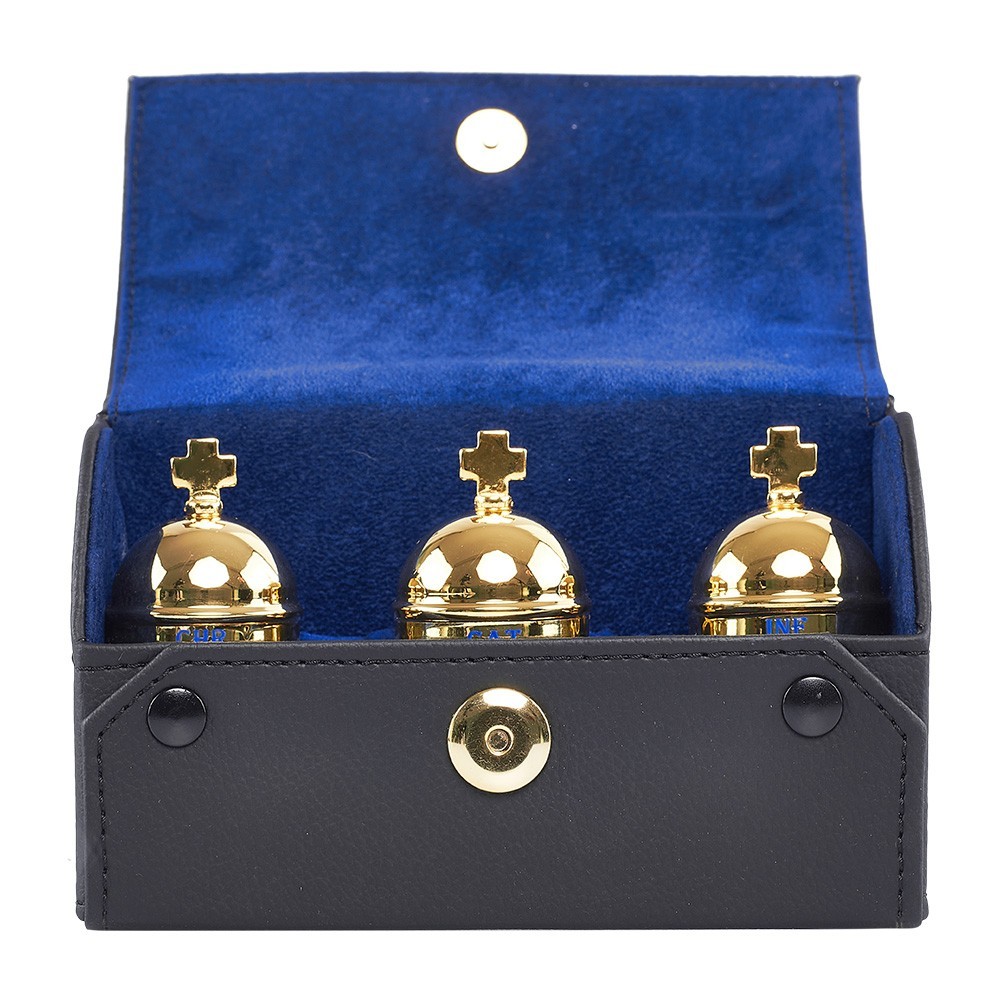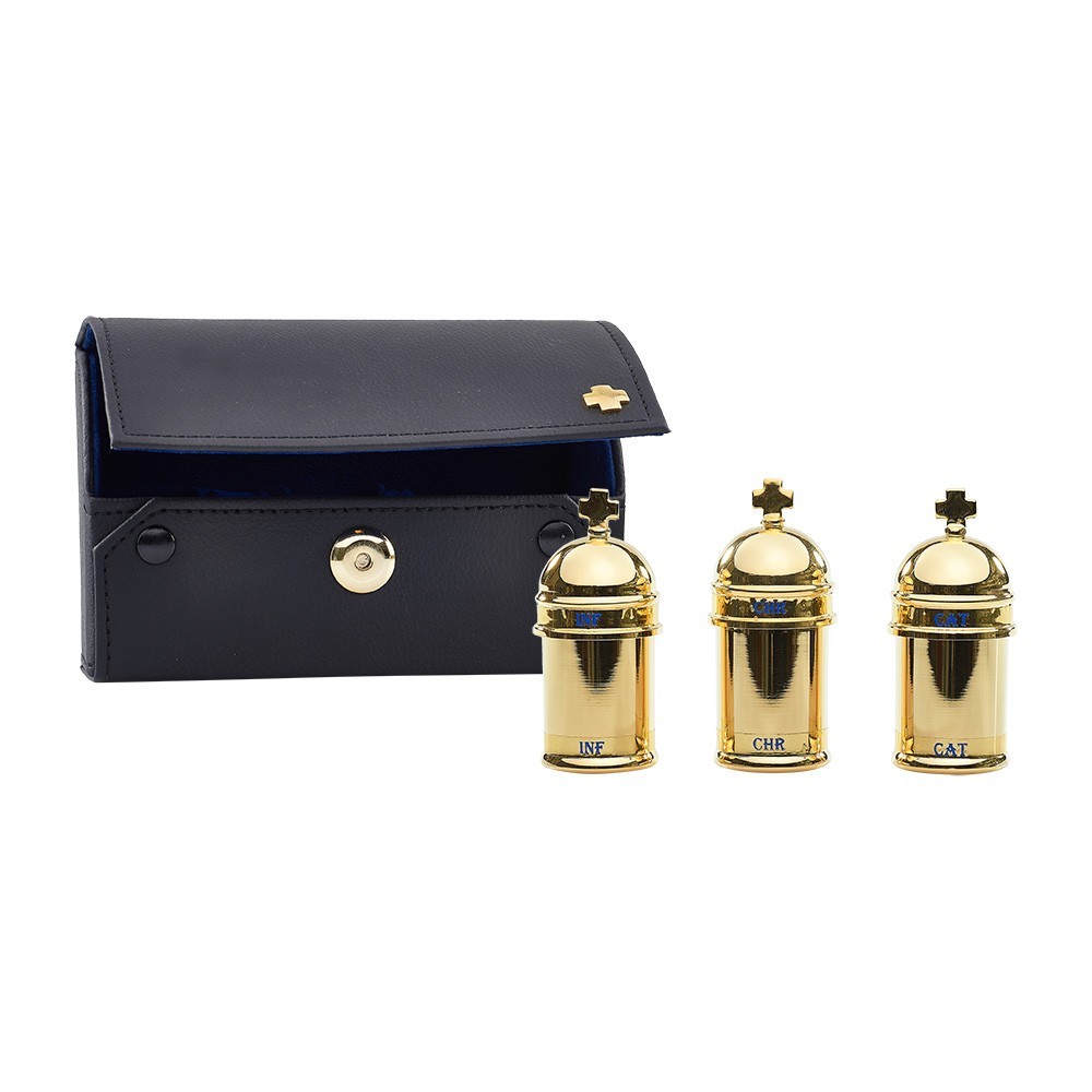 Astuccio con tre vasetti per oli sacri (CAT, INF, CHR). I vasetti sono in ottone dorato e l'interno è in vetro estraibile, completi di tappi con croce piatta. L'astuccio è di colore nero con chiusura a clips.