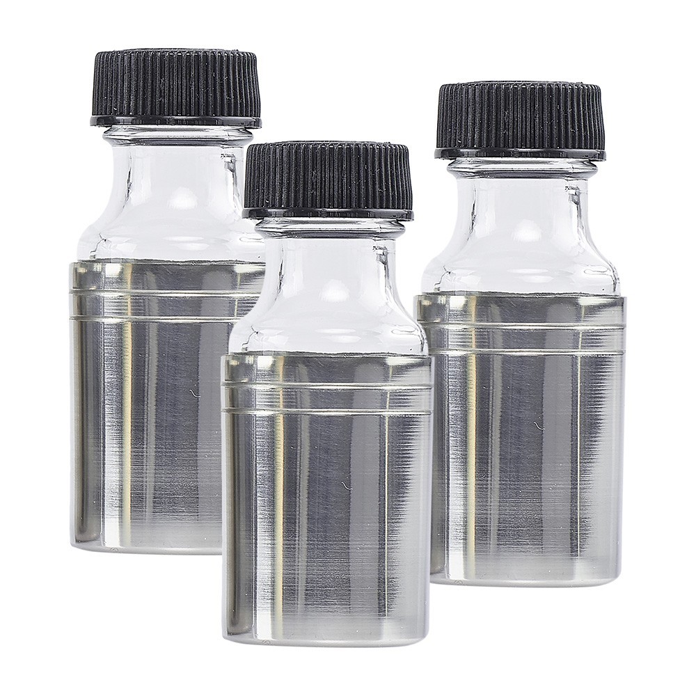 Le bottiglie sono in vetro corazzato e in metallo con finitura argento, il tappo è in plastica. Made in Italy.