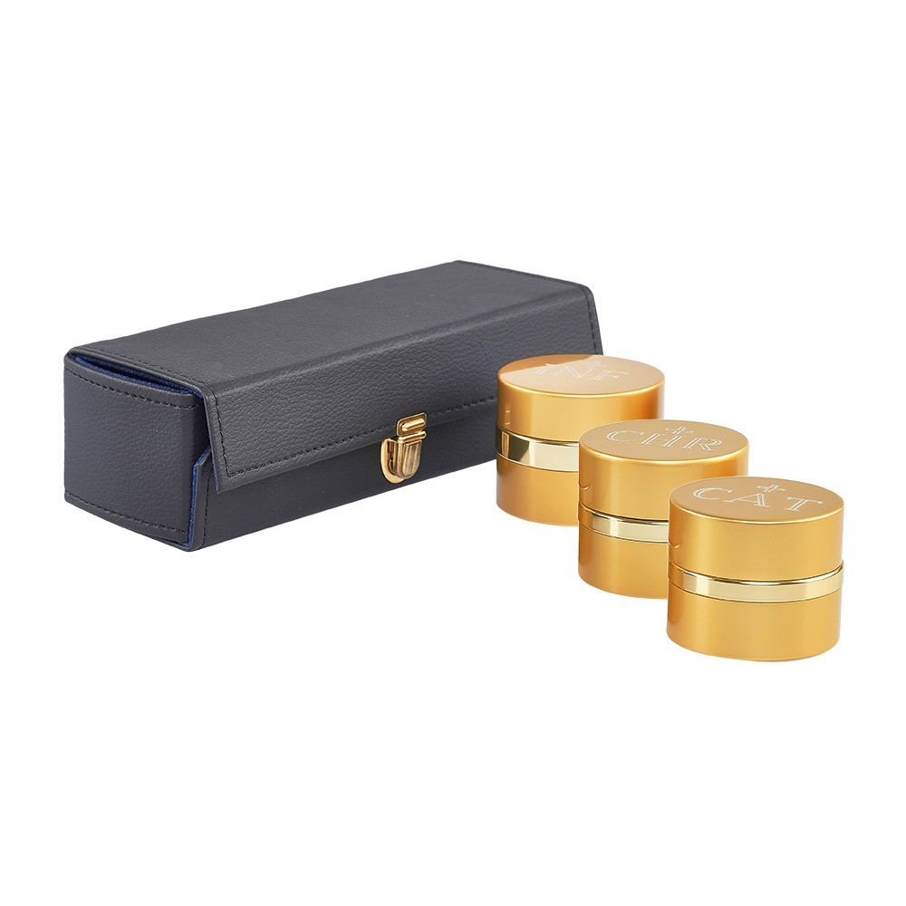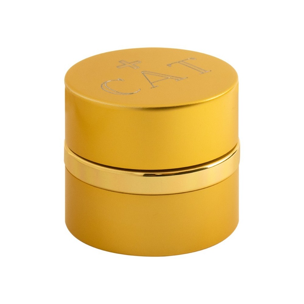 Vasetti per oli santi completi di custodia rettangolare di colore nero. I vasetti sono di forma tonda in alluminio con finitura dorata, di diametro 5,5 cm.