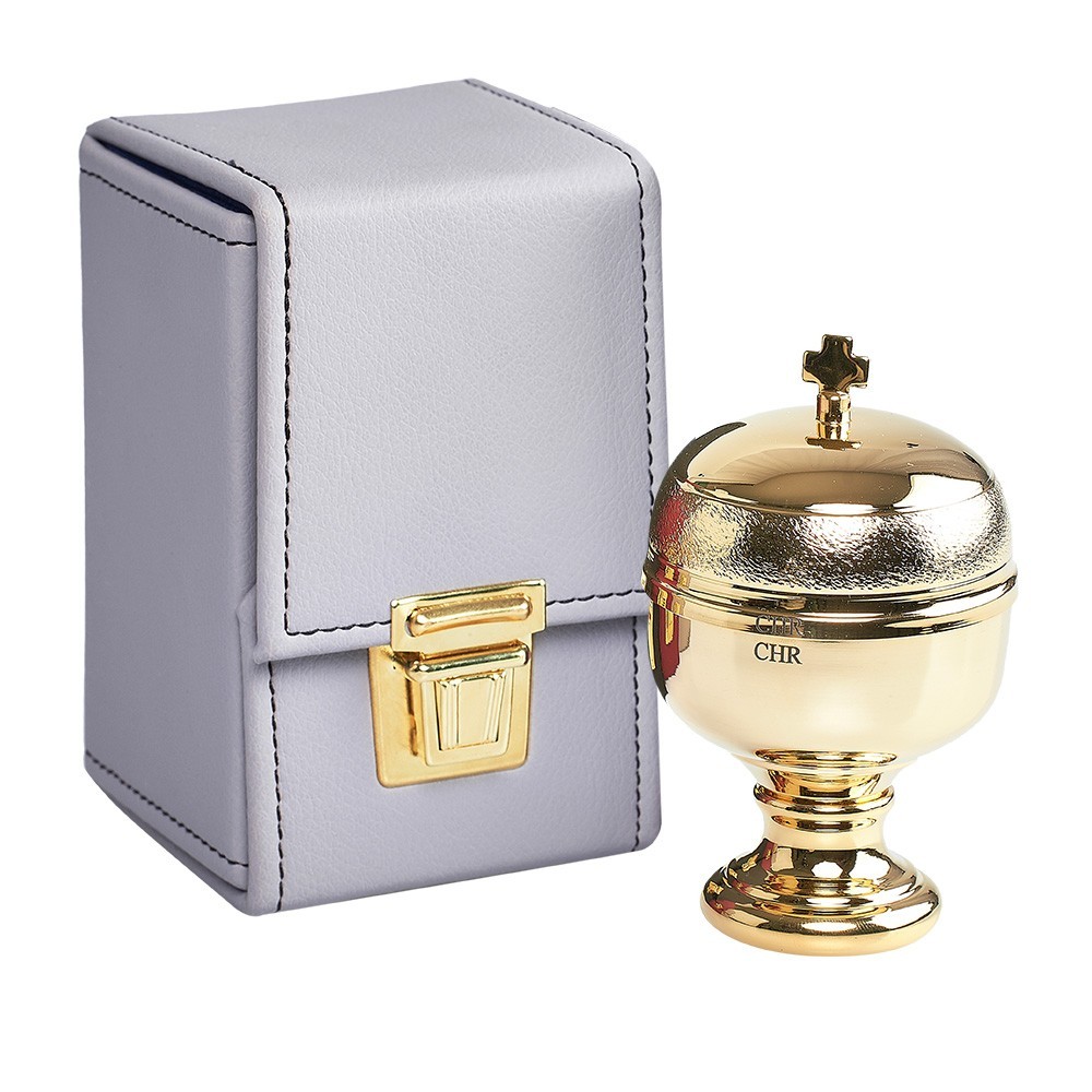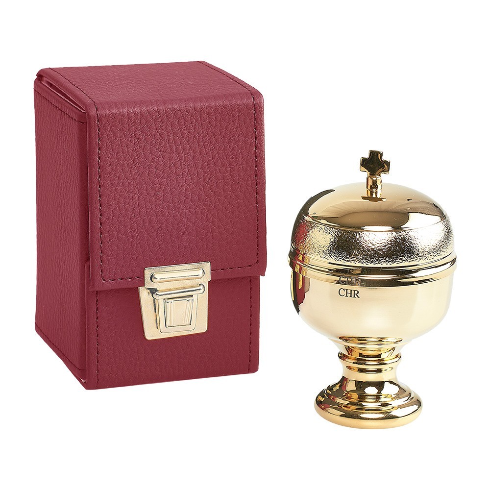 Vasetto per oli sacri CRISMA, in ottone e interno in vetro. La capienza è 50 cc. Produzione italiana.