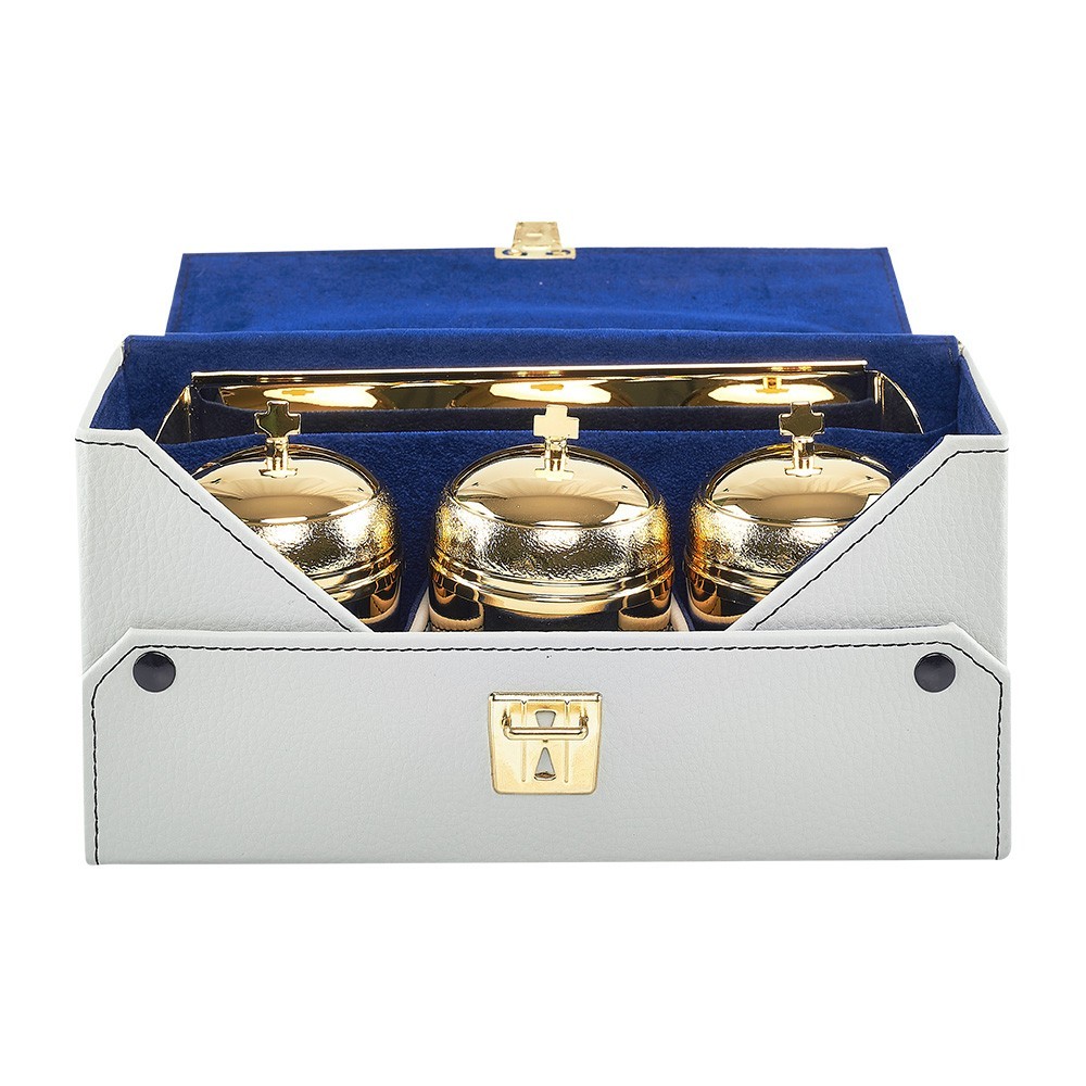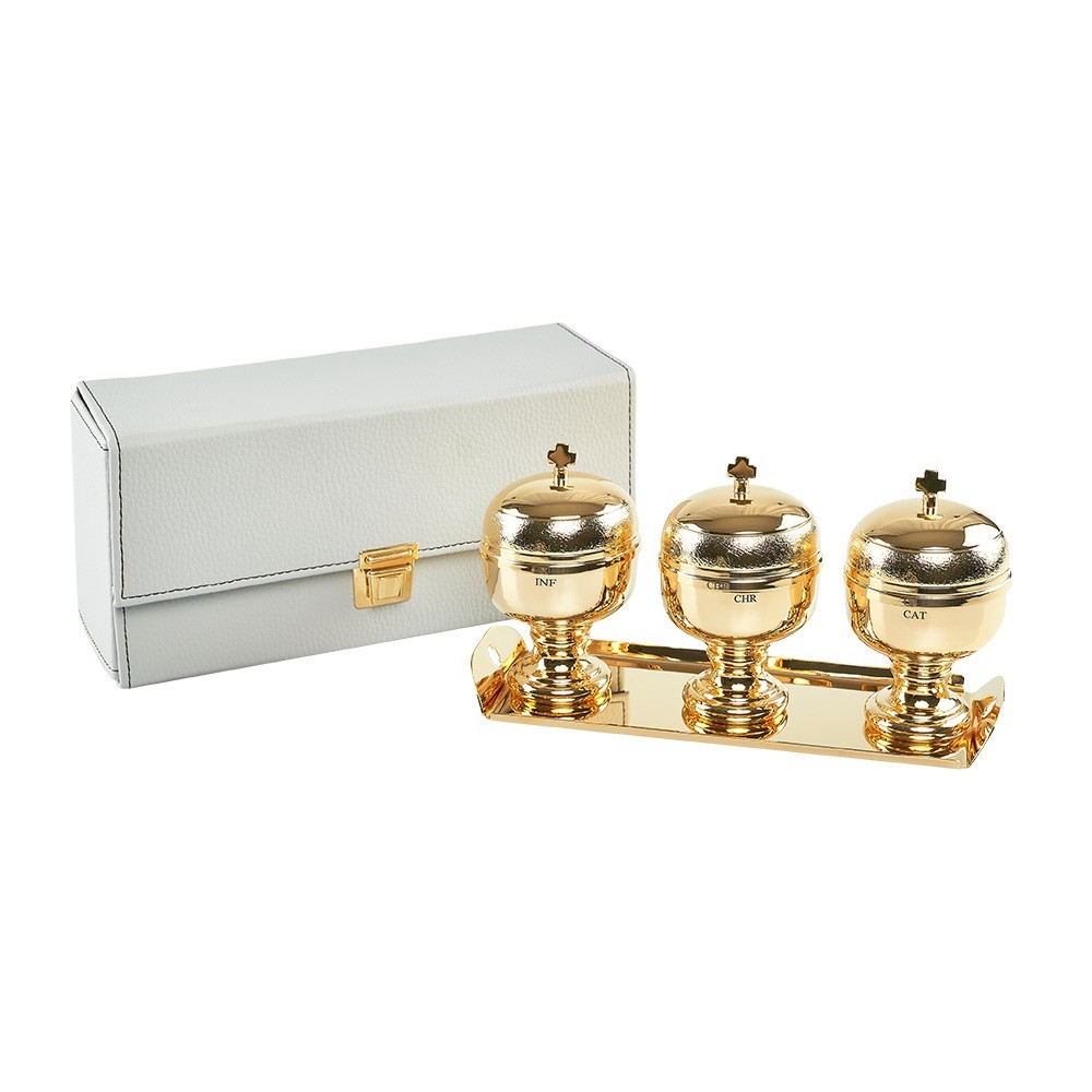 Set di 3 vasetti per oli sacri (CAT; INF; CHR) completi di astuccio colorato e vassoio con ferma vasetti. Il vasetto è realizzato esternamente in metallo dorato e internamente in vetro.