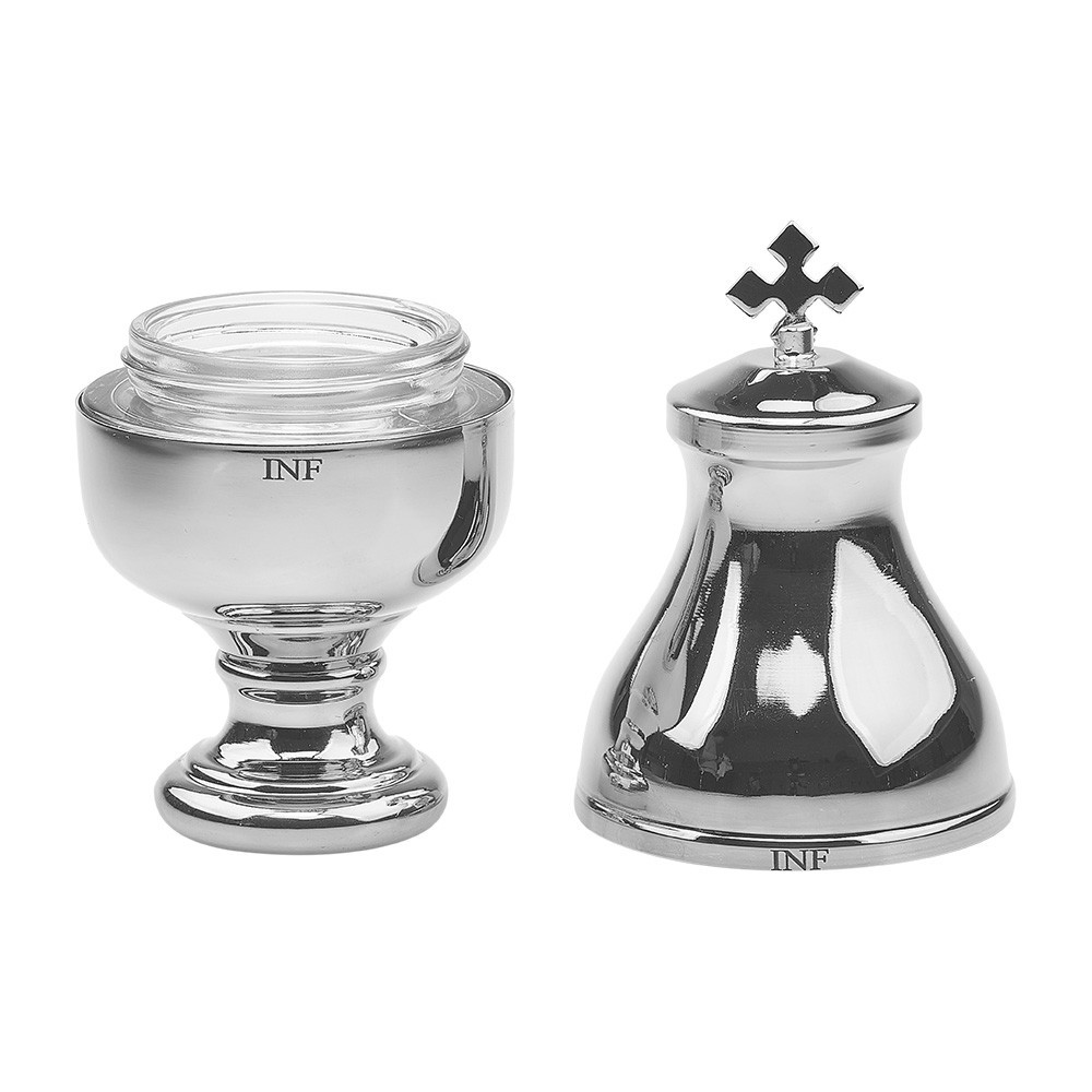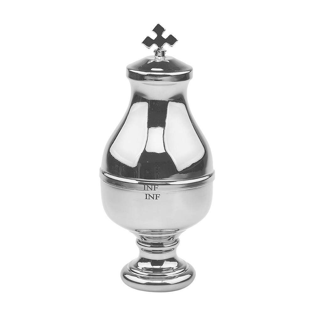 Vasetto per oli sacri INFERMI, con interno in vetro. Realizzato in metallo con finitura argento. Capienza 50 cc.