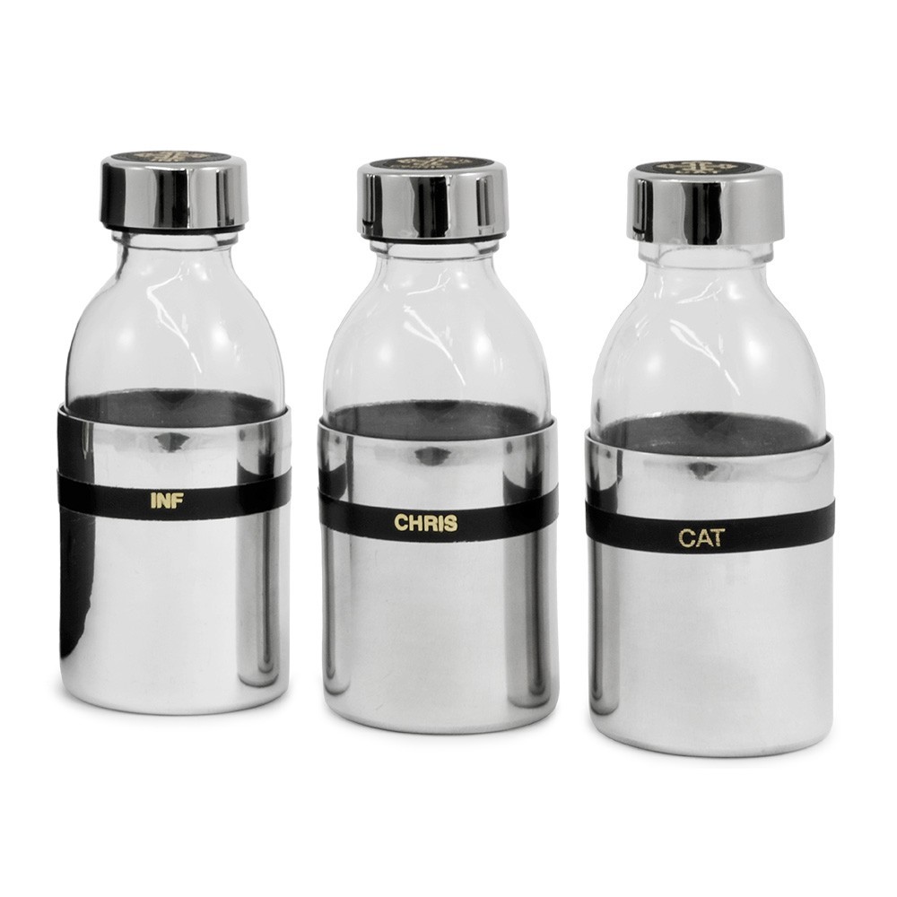L'astuccio è rigido in vera pelle nera. Le bottiglie sono complete di corazza protettiva e di adesivo termostampato INF- CHR - CAT e hanno una capienza di 125 ml.