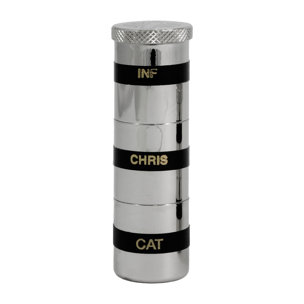 I vasetti sono tre realizzati interamente in ottone con finitura argento e sono completi di adesivo con scritta oro INF - CHRIS - CAT.