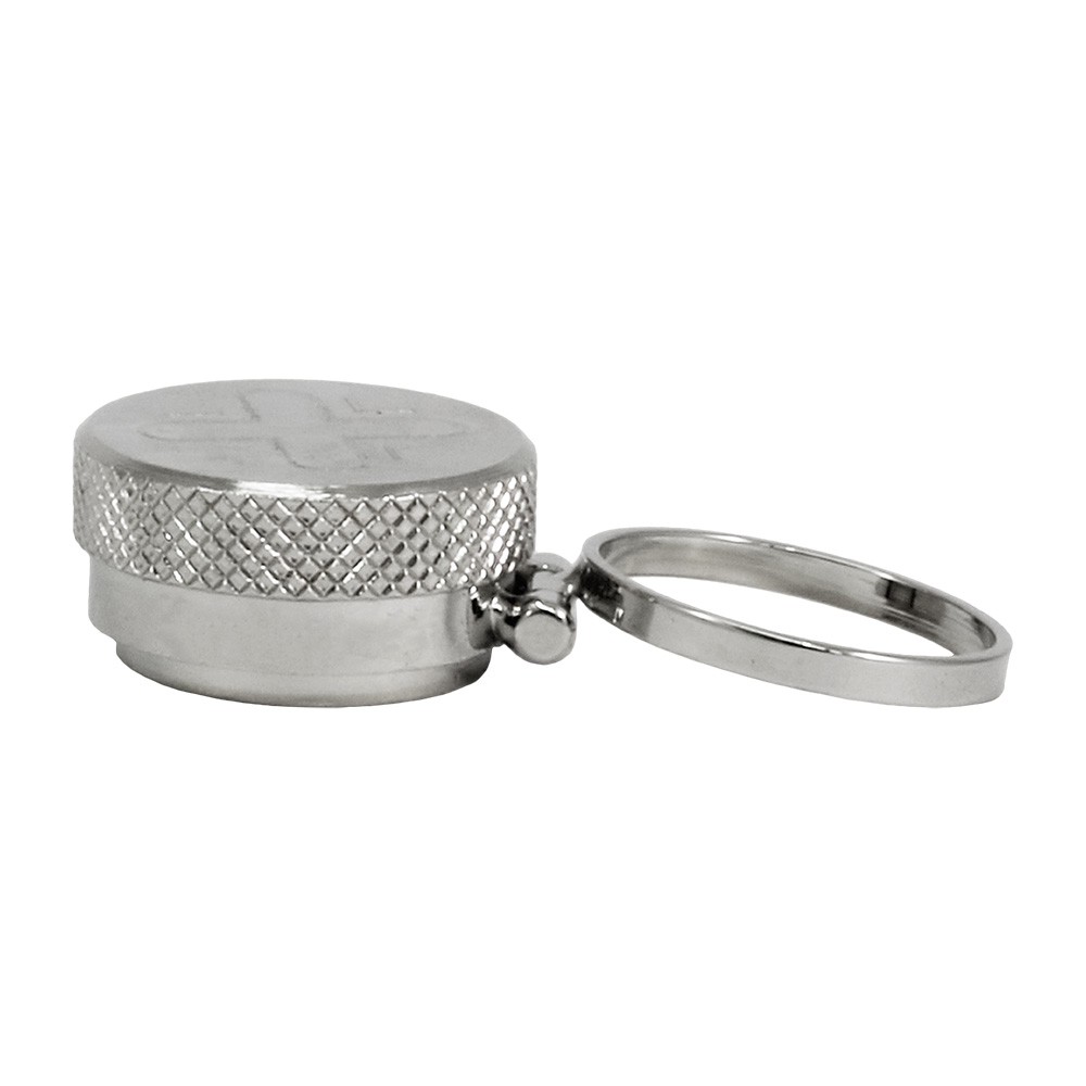 Questo mini vasetto adatto per il contenimento di oli sacri è completo di anello richiudibile, realizzato in ottone argentato con croce incisa sul tappo. Il contenitore è alto 2 cm.