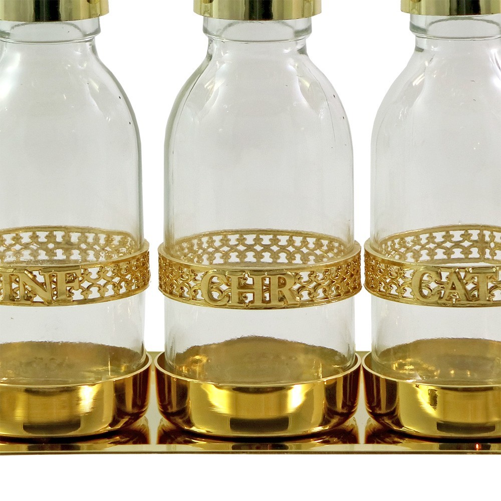 Questo servizio liturgico è composto da un vassoio in ottone dorato 24k e tre bottigliette per oli Santi con ghiera in fusione dorata INF- CHR- CAT.