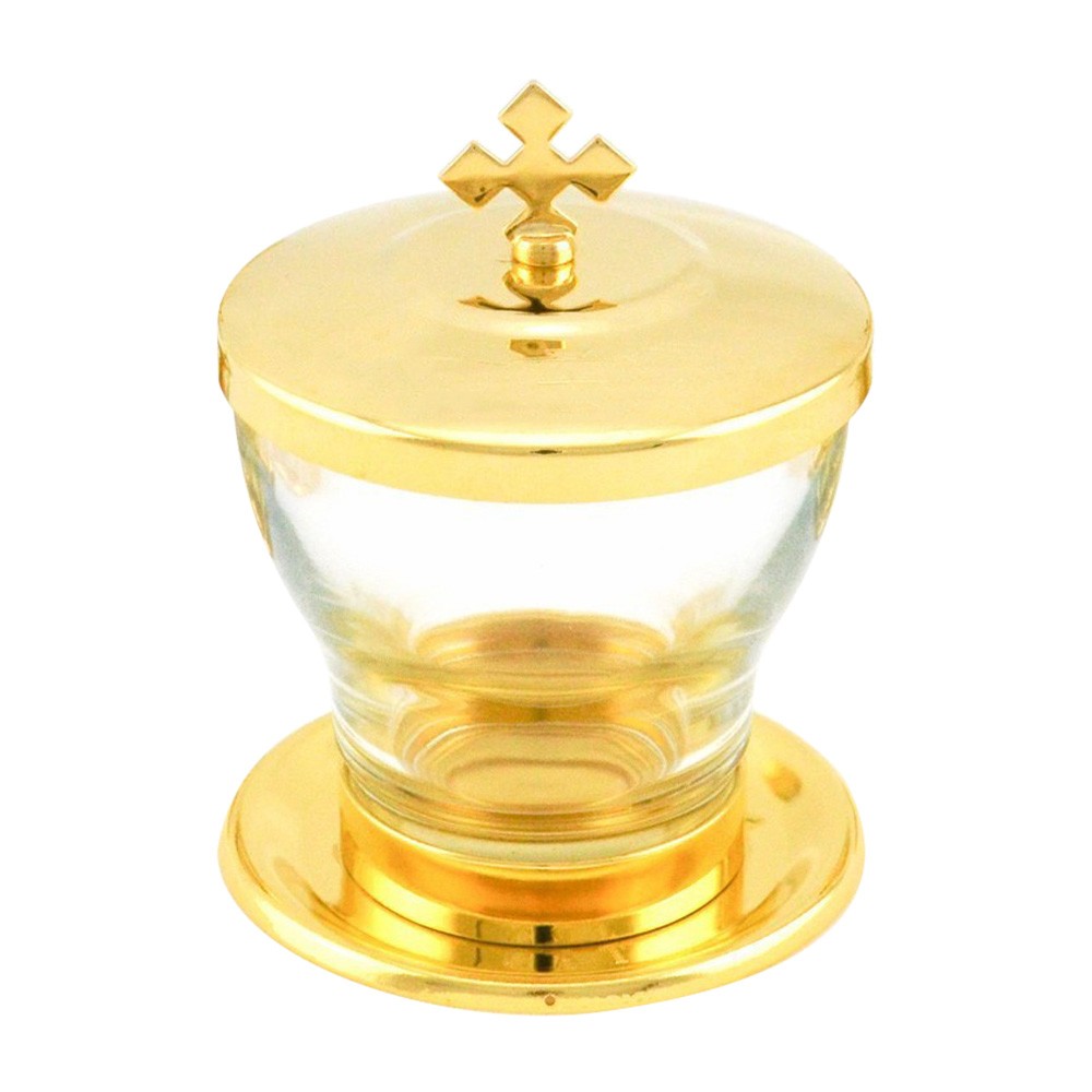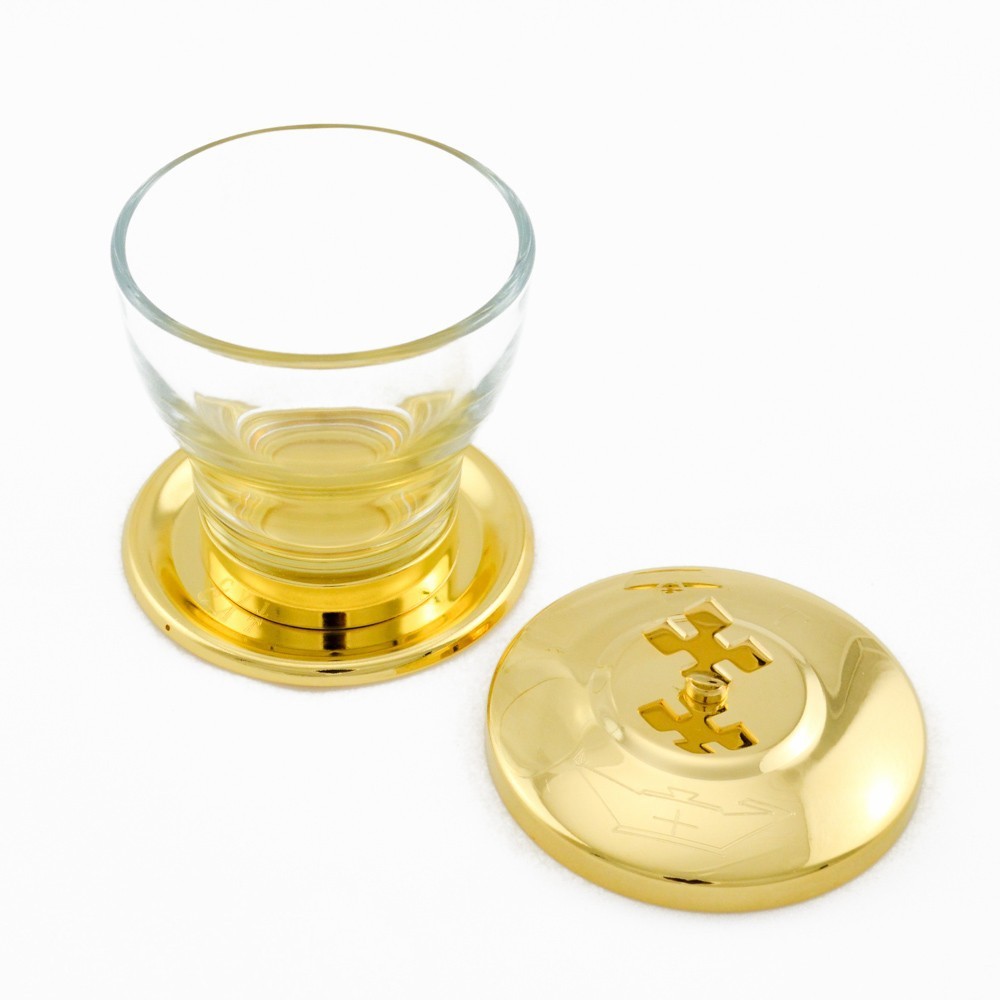 Vasetto per Olio santo Crisma da cc 50, realizzato in vetro e ottone. Sul coperchio è decorata una lampada ed è incisa l'iniziale CHR.
