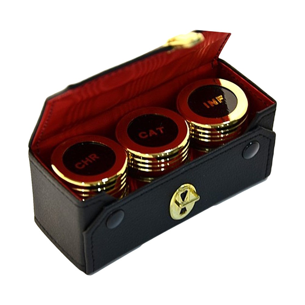 Consegna in 2 settimaneTre bottigliette per oli sacri in custodia rigida con serratura.