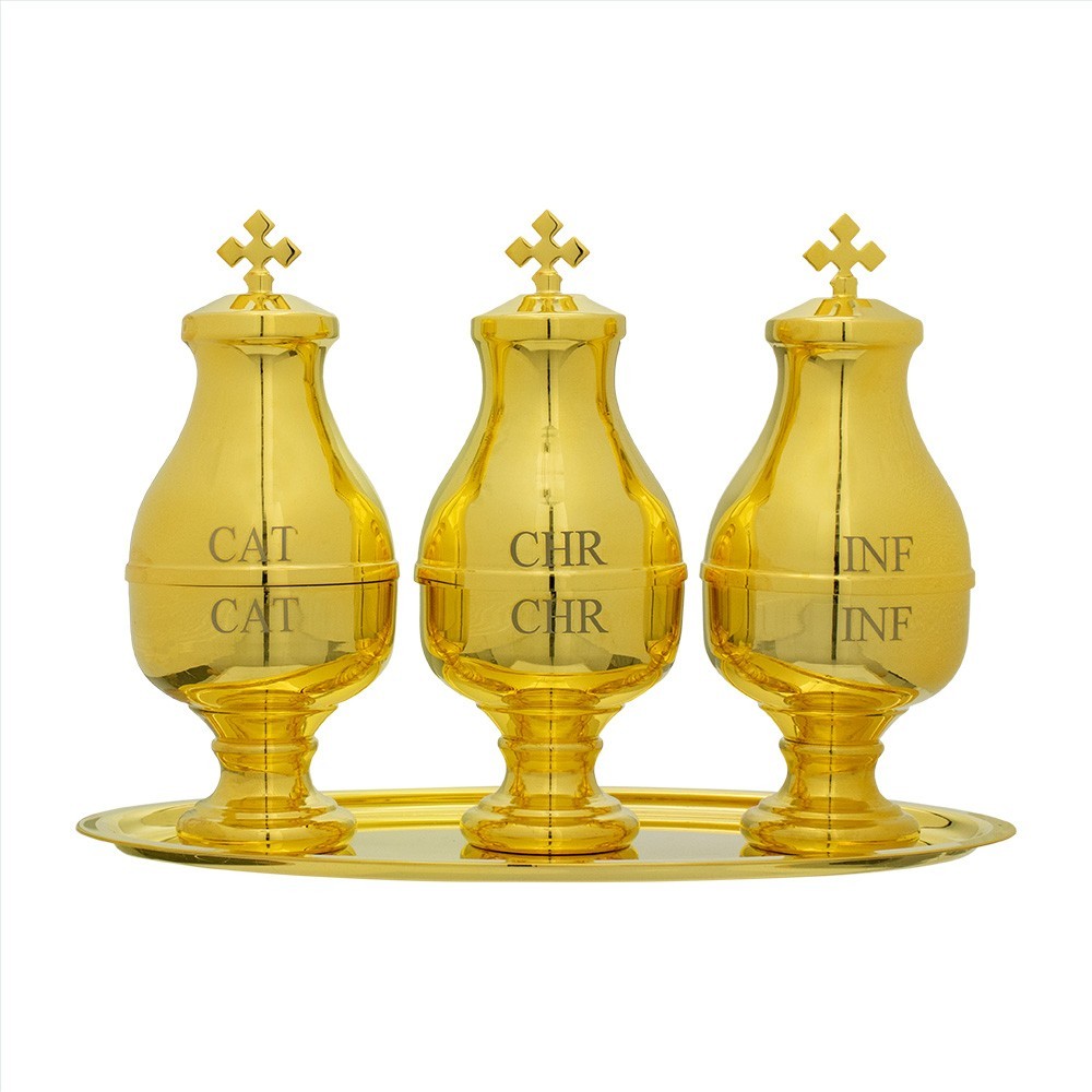Set completo di tre vasetti di oli santi con vassoio. I vasetti e il vassoio sono in ottone dorato con interni in vetro. I vasetti per oli Crisma, Infermi e Catecumeni sono alti 15 cm con diametro di 6,5 cm (capienza massima 50 cc).