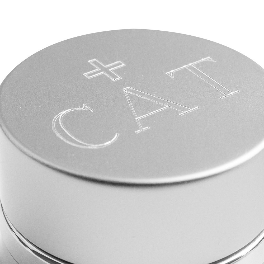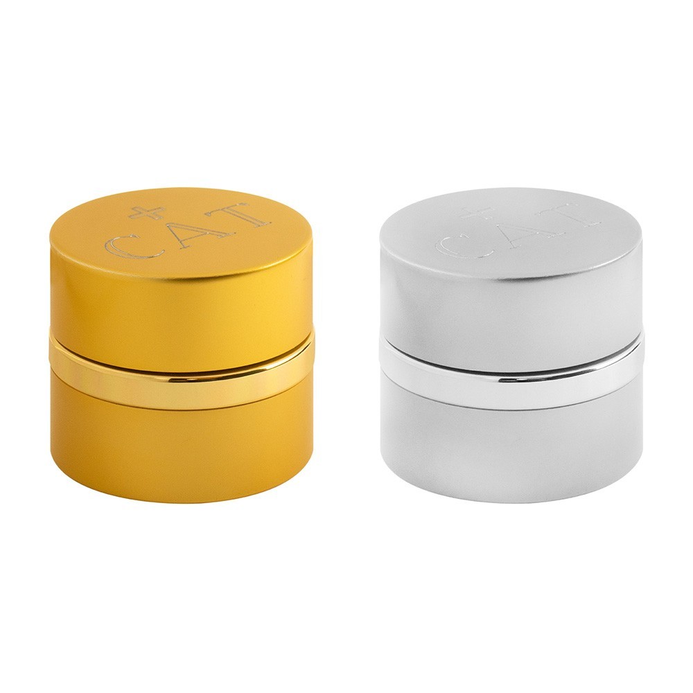 Vasetto per olio santo Catecumeni. Sono di forma tonda e sono realizzati in alluminio. L'interno del vasetto è in vetro ceramica bianco, la chiusura è ermetica e il tappo è decorato con croce e scritta CAT. Il vasetto misura 4 cm di diametro.