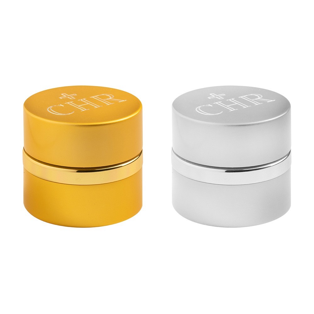 Vasetti per oli santi CRISMA, diametro 5 cm ca. Questi vasetti sono in alluminio color oro e argento. L'interno del vasetto è in caramica bianca, con chikusura ermetica. Sul tappo vi è incisa una piccola croce e la scritta INF.