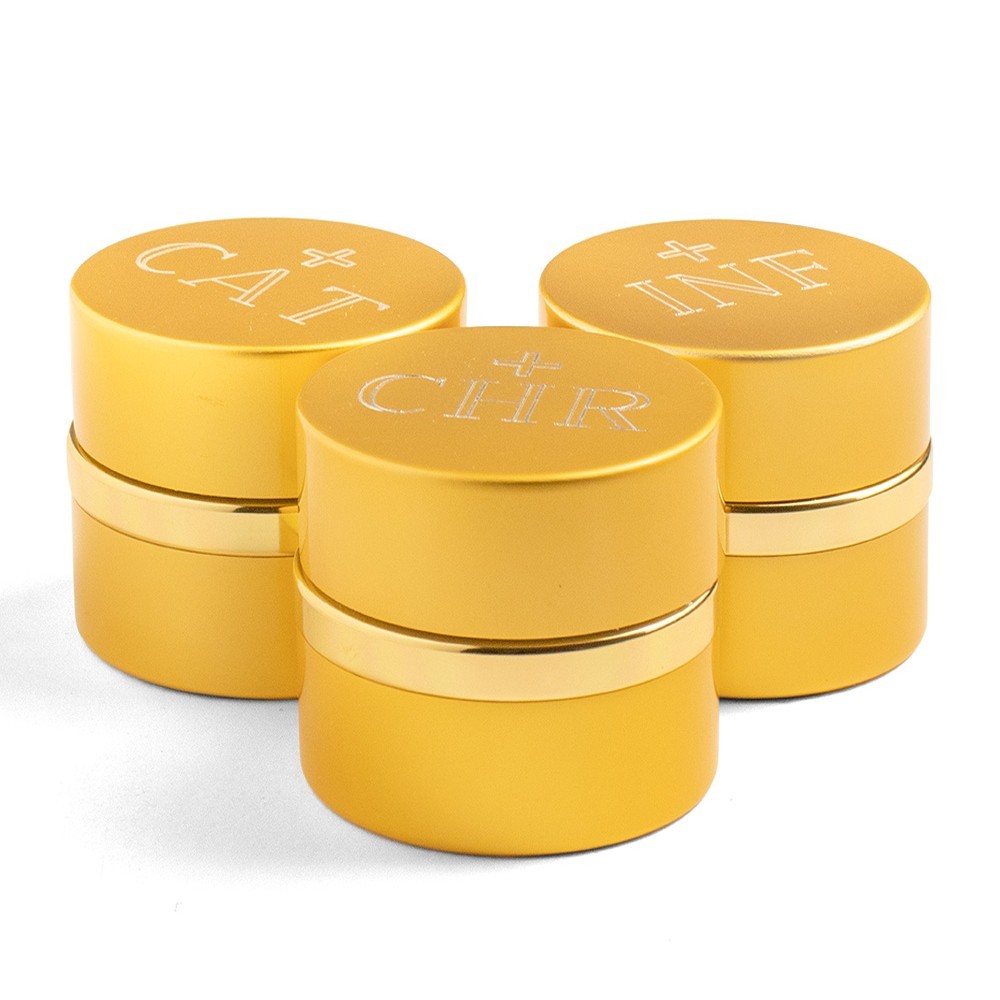 Tre vasetti oli santi INF, CAT, CHR in alluminio color oro da Ø 4 cm.