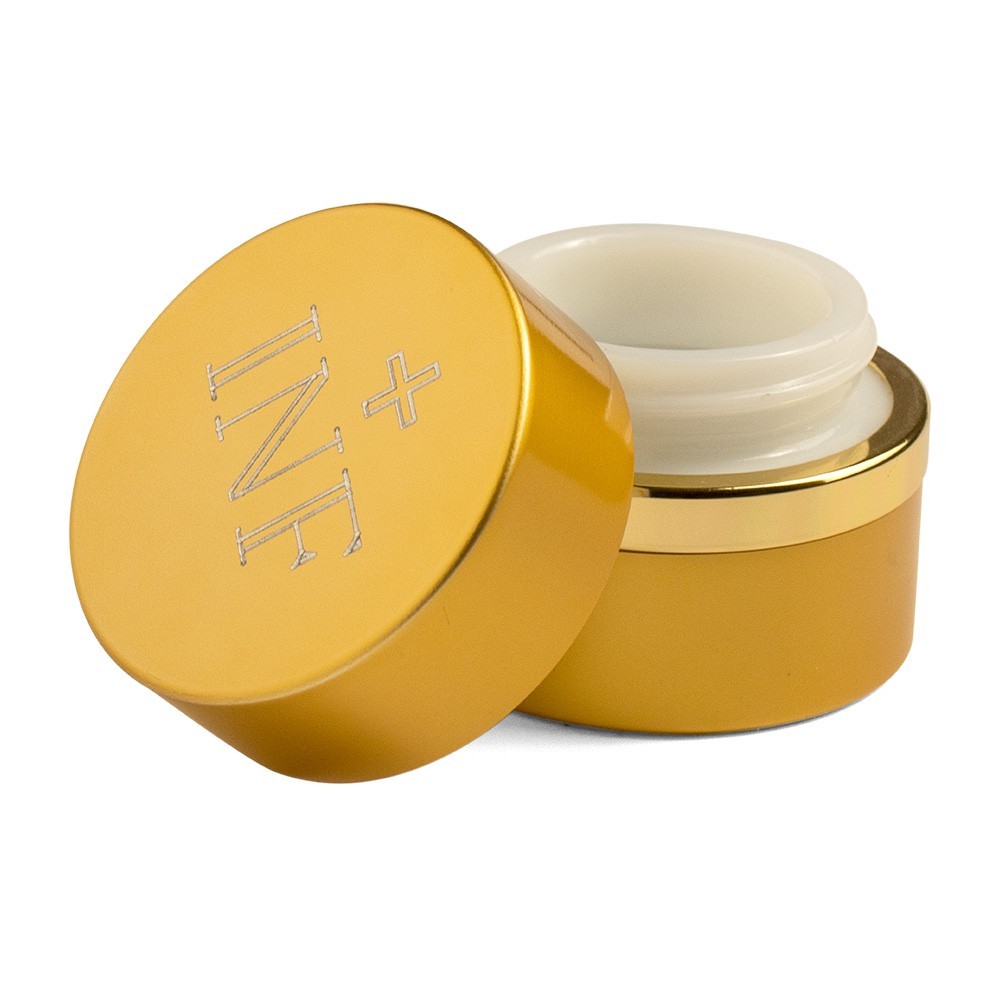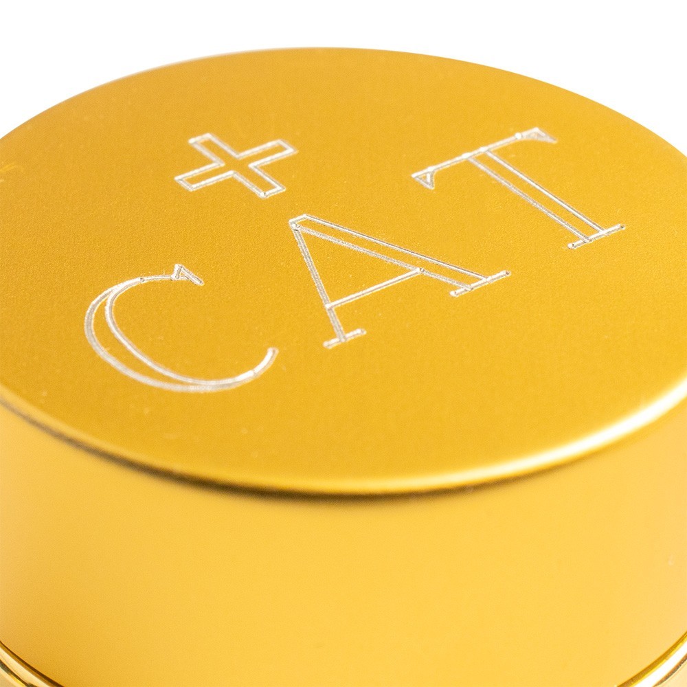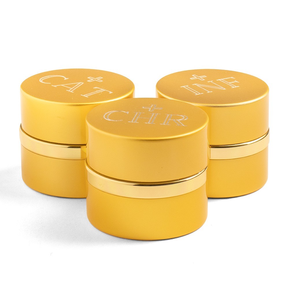 Tre vasetti oli santi INF, CAT, CHR in alluminio color oro da Ø 4 cm.