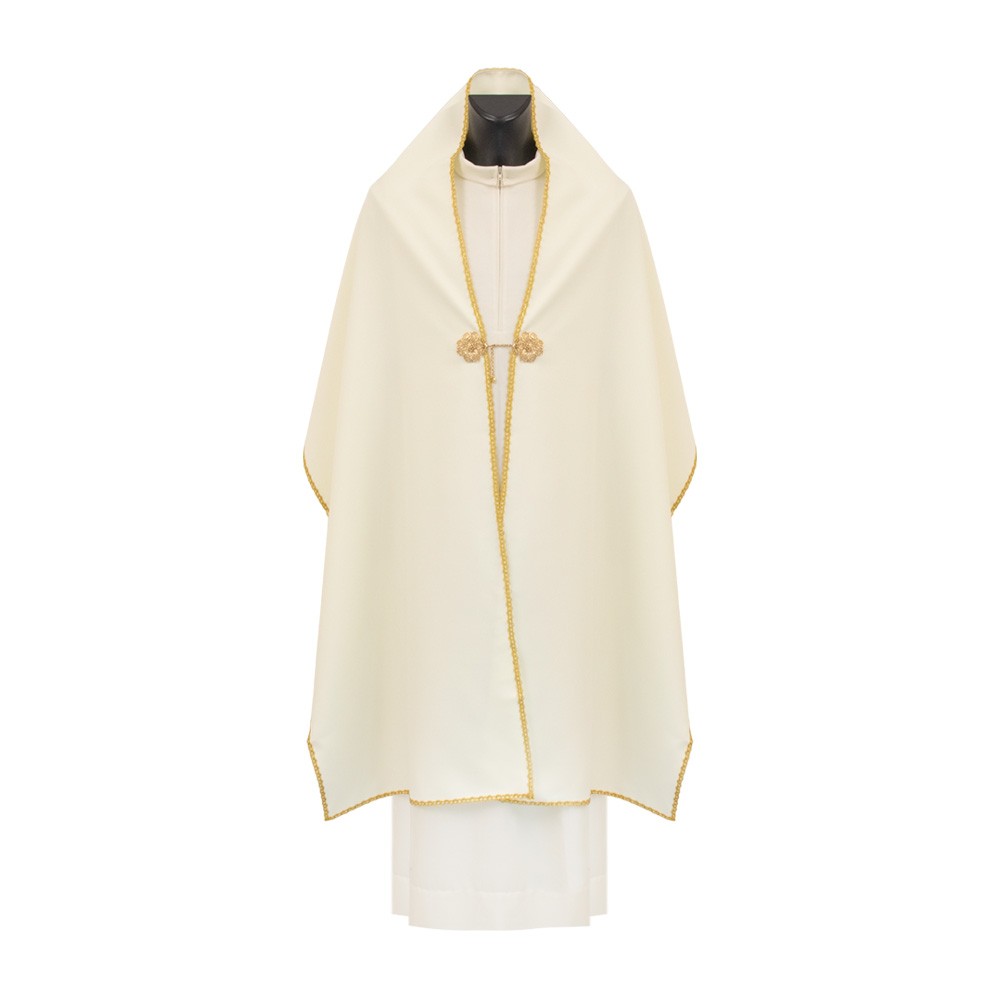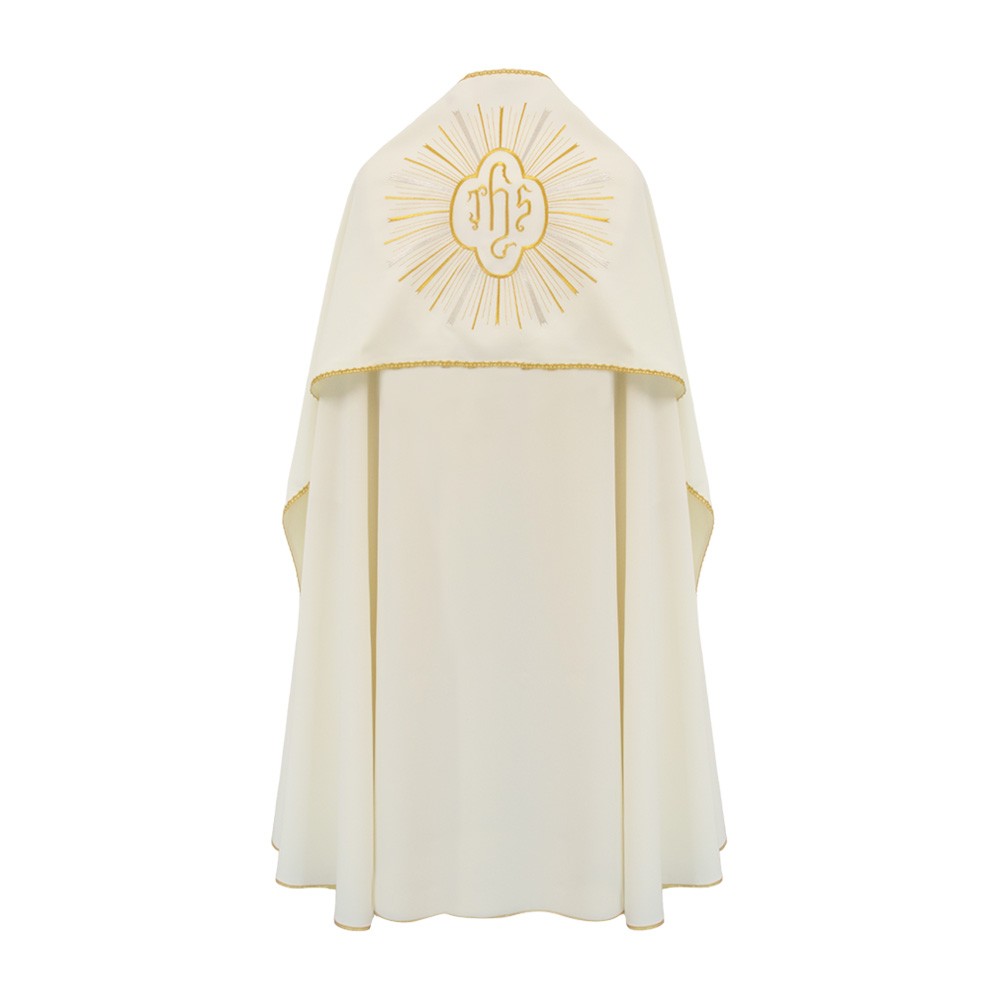 Il paramento liturgico si presenta con ricamo dorato JHS contornato da raggi, chiusura con ganci in metallo color oro. Lungo tutto il profilo vi è uno sbieco dorato che rifinisce tutte le cuciture.