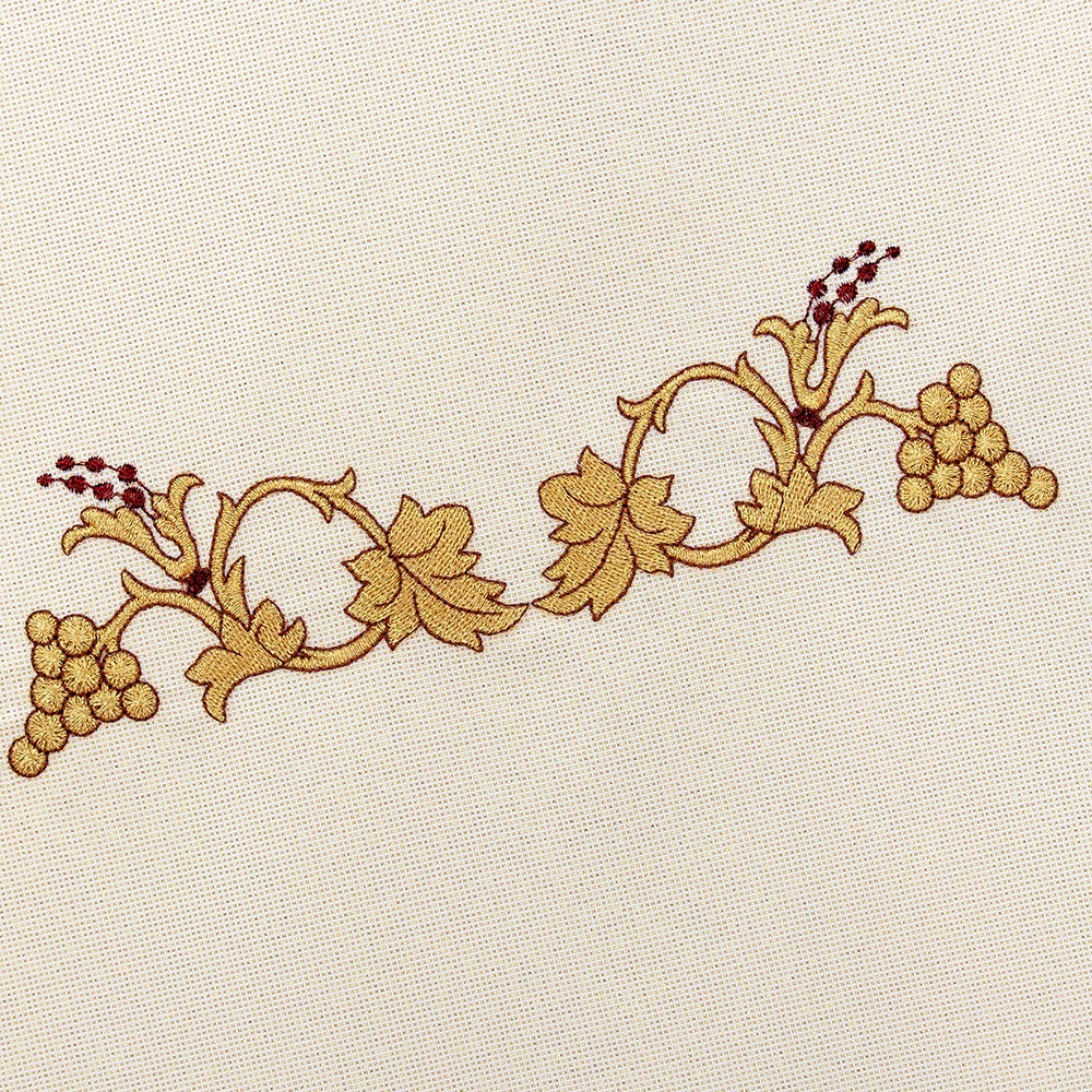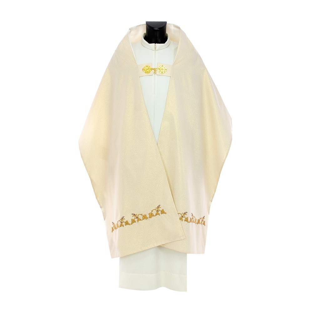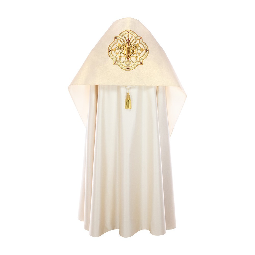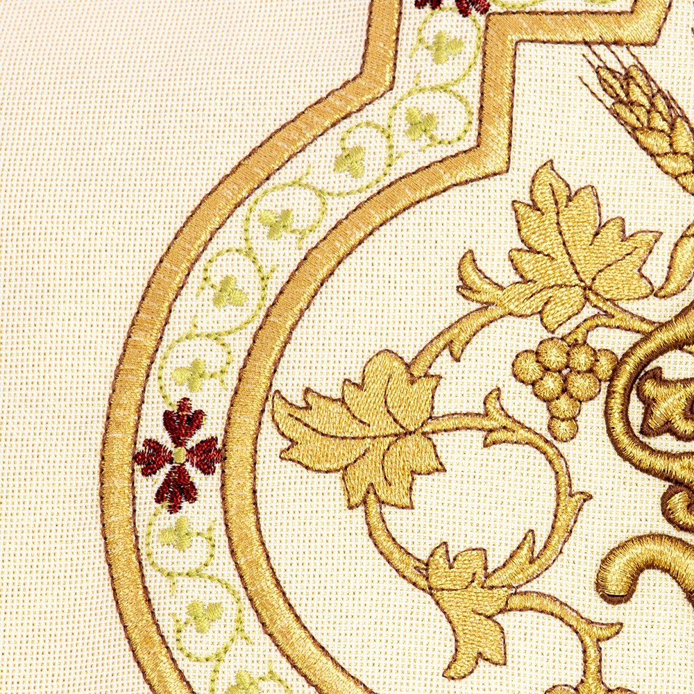 Il velo omerale è confezionato in elegante e resistente tessuto in poliestere di colore ecrù gold e con ricamo eseguito a macchina. I filati utilizzati per il ricamo sono di colore dorato e rosso. Completo di chiusura con ganci in ottone dorato. Realizzato da una sartoria polacca, garantendo tessuti di ottima qualità molto piacevoli al tatto.