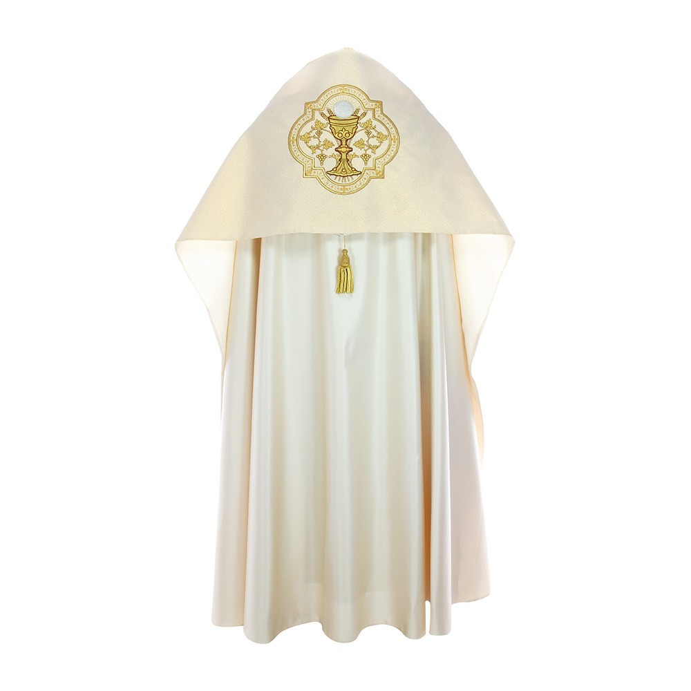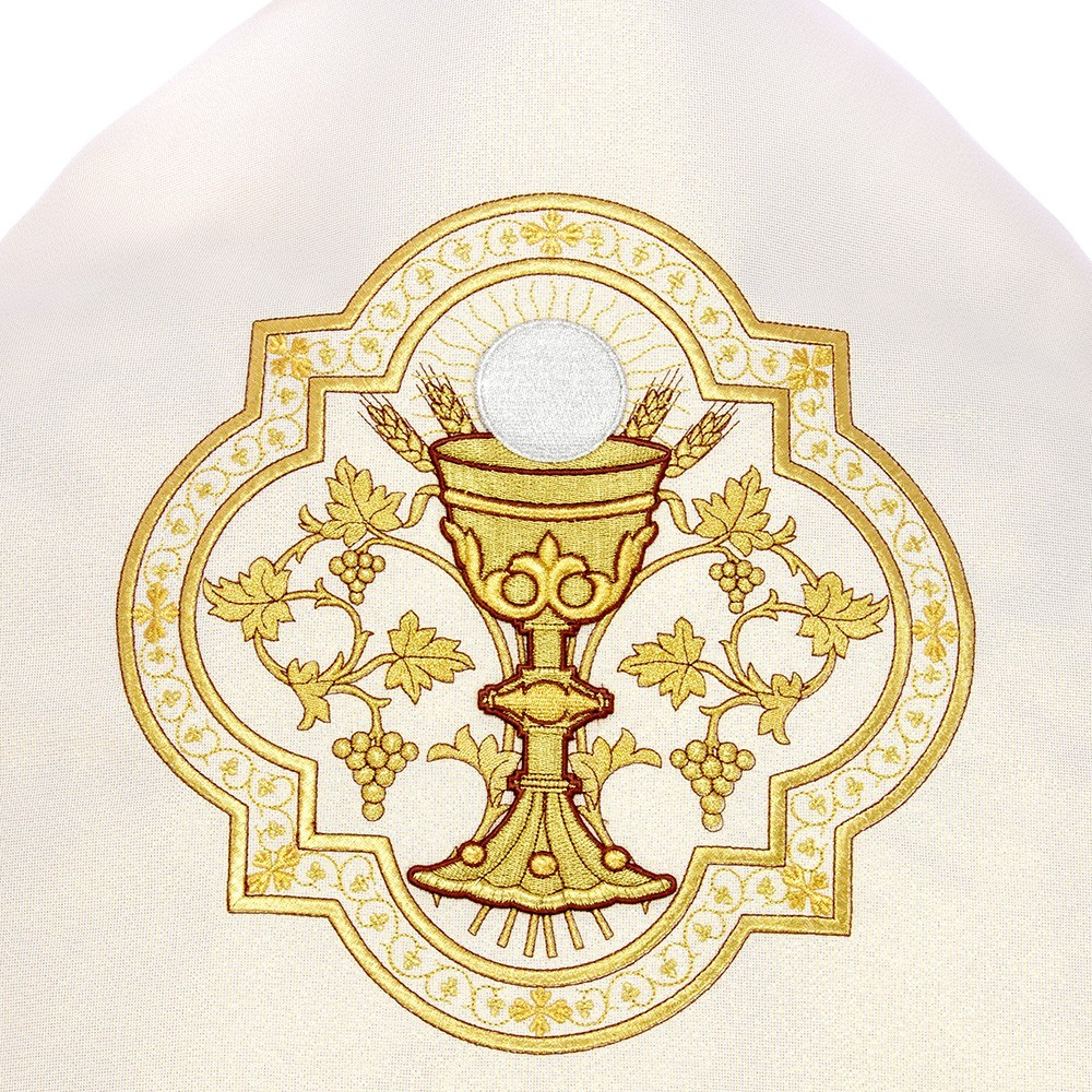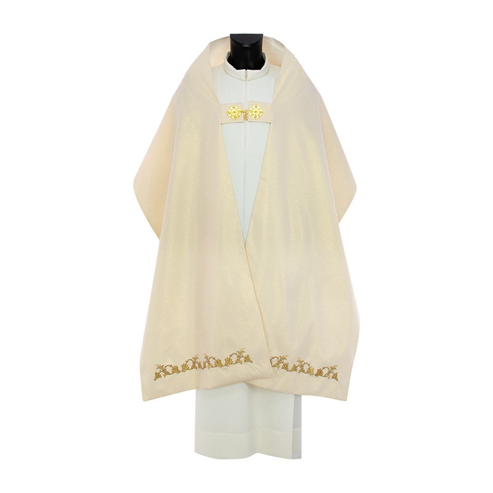 Questo paramento presenta un grazioso ricamo con filati color oro, confezionato in ottimo e fresco tessuto poliestere. Completo di ganci in metallo dorato per abbottonarlo e tasche all'interno. Realizzato da una sartoria polacca, garantendo tessuti di ottima qualità molto piacevoli al tatto.