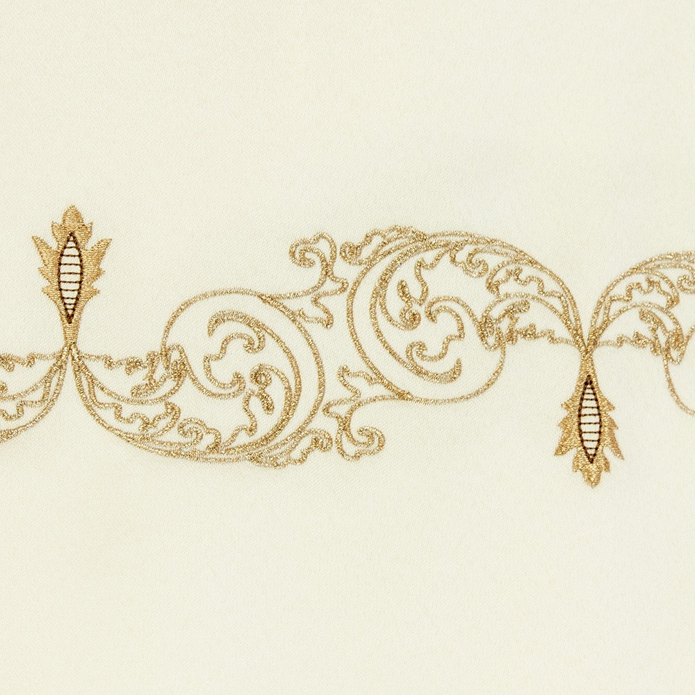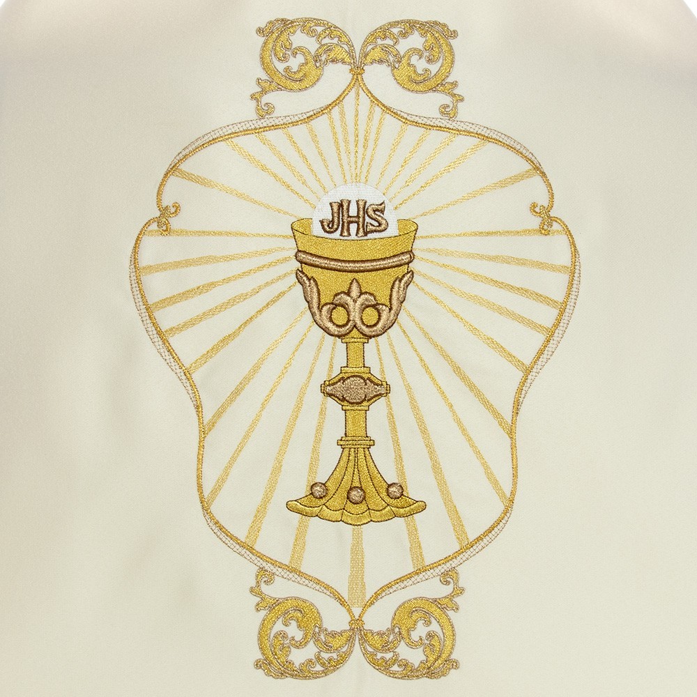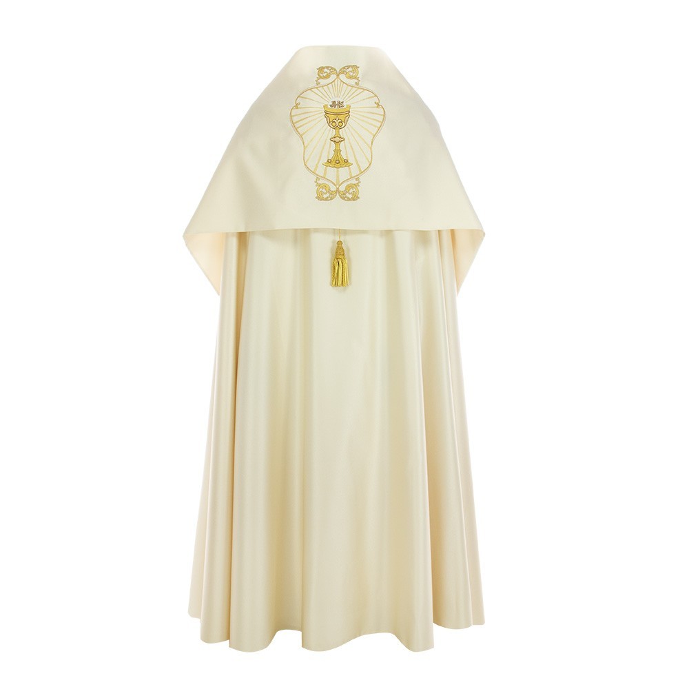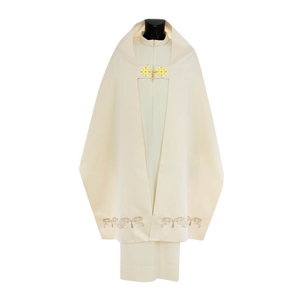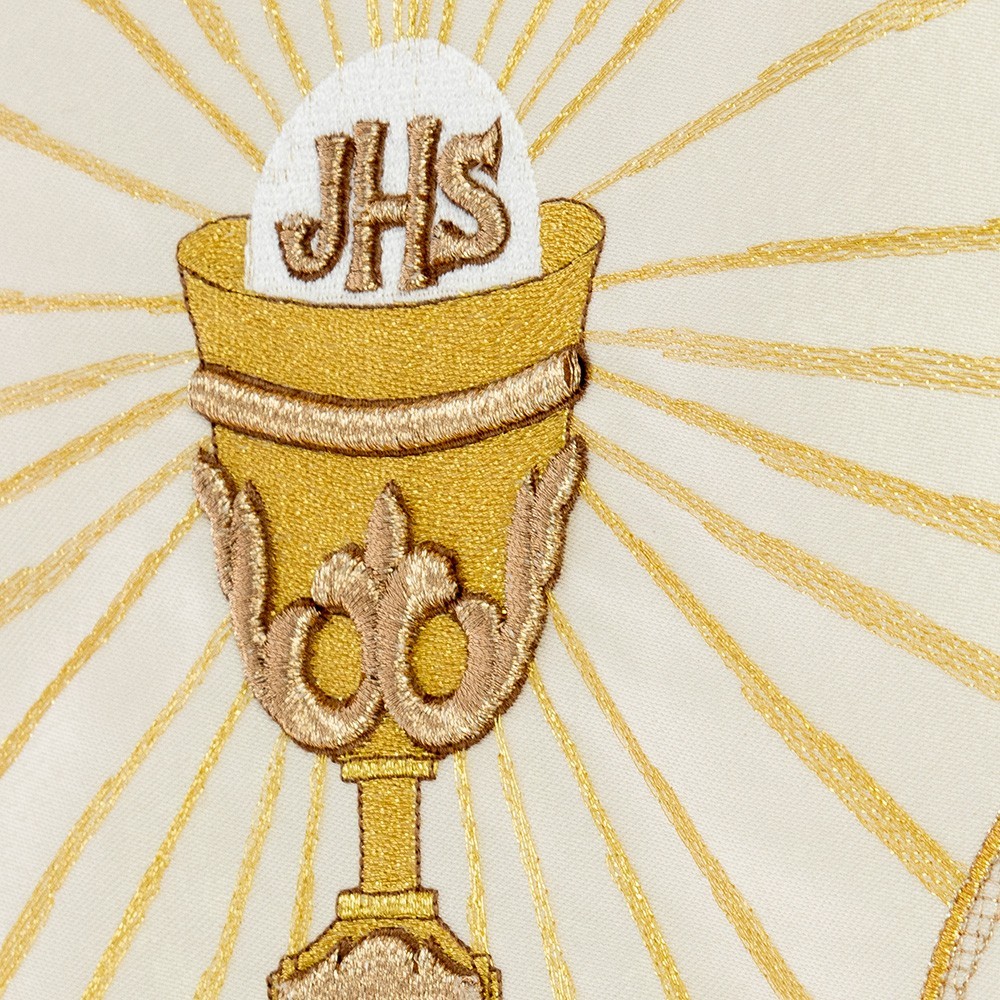 Velo omerale per sacerdotale di colore ecrù avorio. Questa veste liturgica è finemente decorata con filati color oro, confezionato in ottimo e fresco tessuto poliestere. Completo di ganci in metallo dorato e di tasche interne. Realizzato da una sartoria polacca, garantendo tessuti di ottima qualità molto piacevoli al tatto.