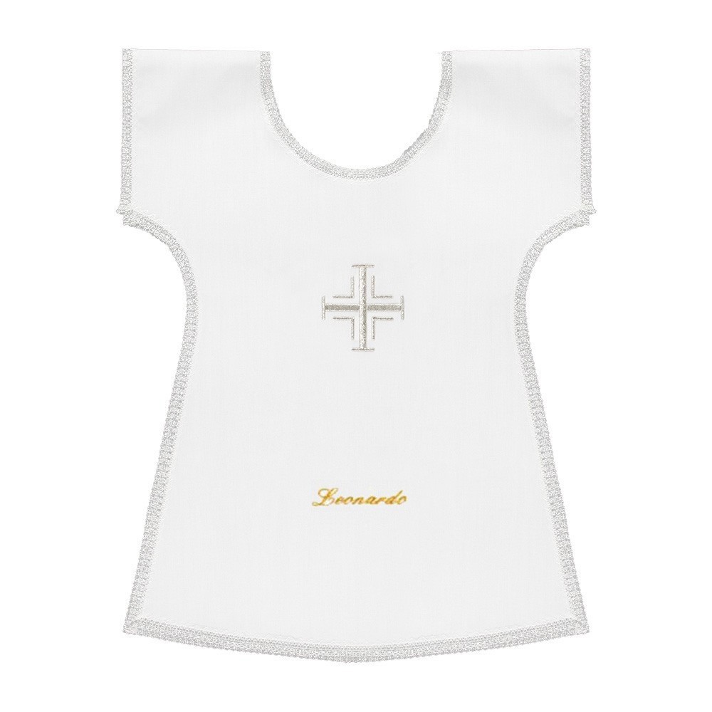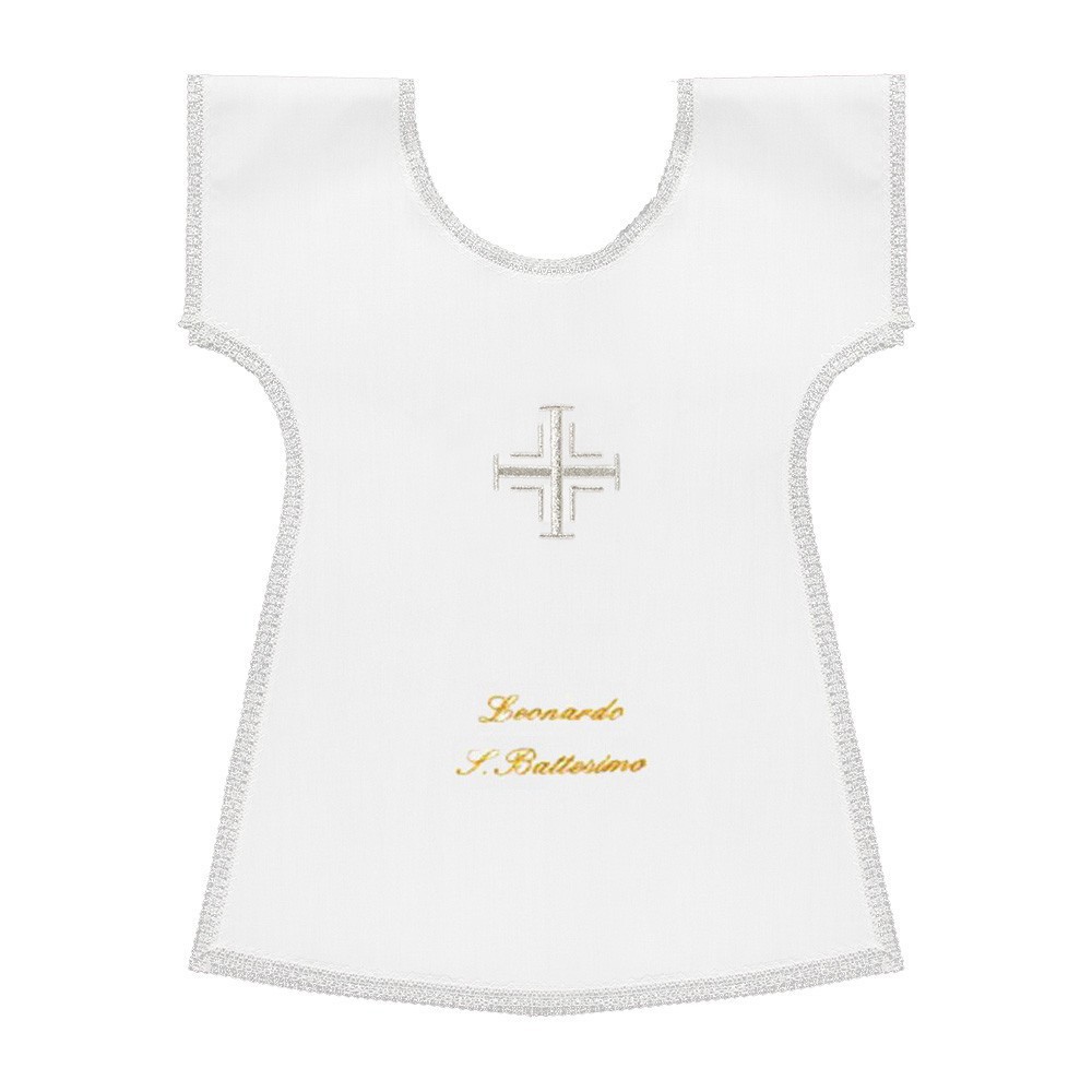 Vestina Battesimale con un grazioso e delicato ricamo raffigurante la Croce di Gerusalemme. Questa camicina è in tessuto misto poliestere e cotone, molto leggero e fresco. Prodotto 100% italiano.