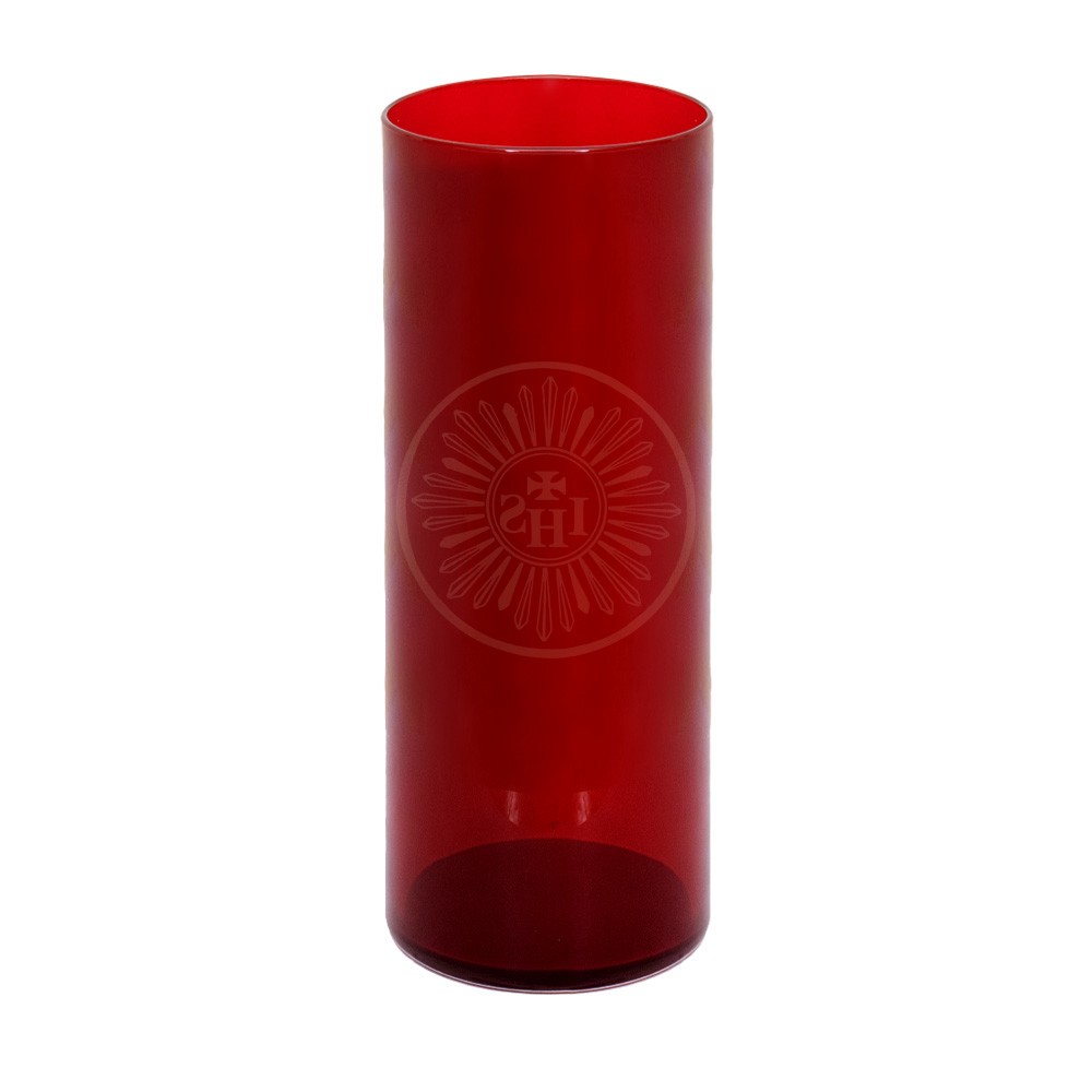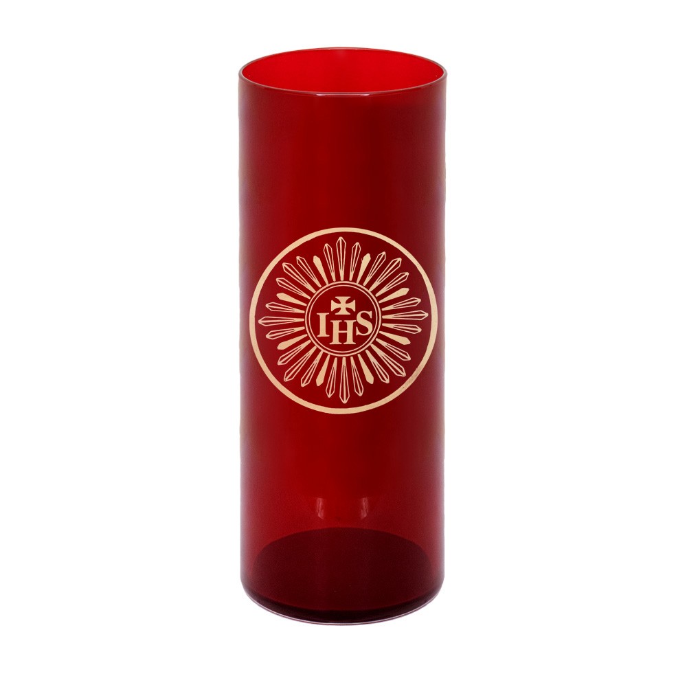 Bicchiere in vetro rosso con adesivo per lampada del Santissimo.